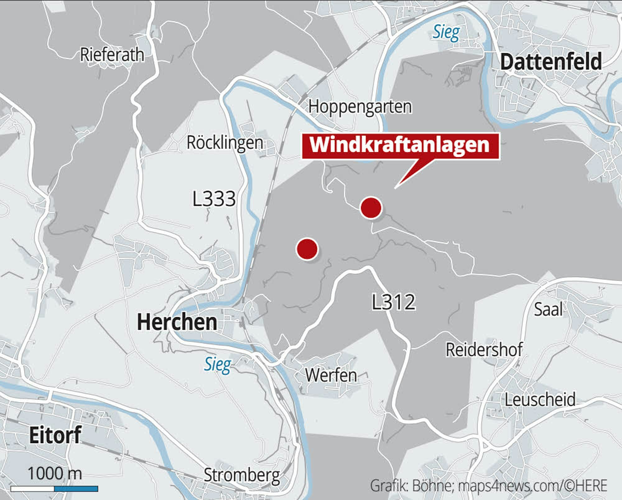 Fledermäuse könnten vom Sog erfasst und getötet werden. Davon abgesehen seien komplette Naturschutzgebiete, der benachbarte Wald ebenso wie die FFH-Gebiete am Siegufer, gefährdet, weil die nötigen Abstände nicht eingehalten würden. Das gelte im Übrigen auch für die rund 800 Meter entfernt stehenden Häuser.