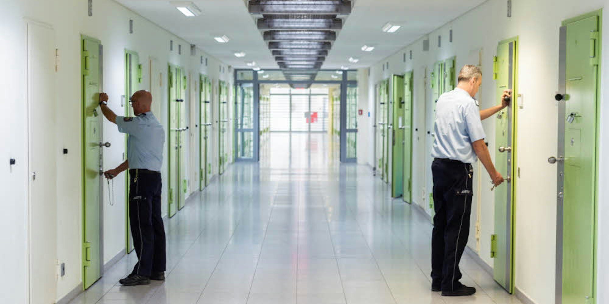 Zwei Beamte öffnen Zellen in der JVA Düsseldorf