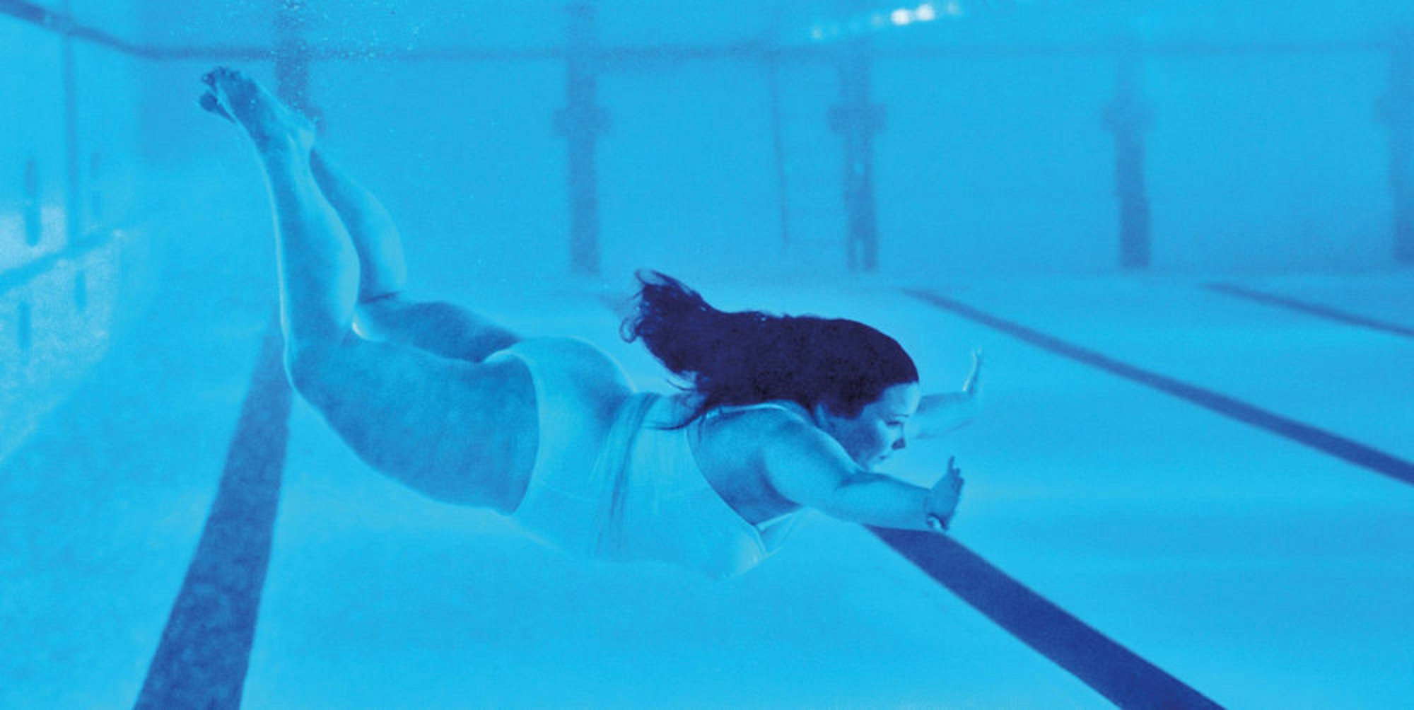 An den Wänden hängen Bilder von übergewichtigen Männern und Frauen. Eines der Fotos wurde unter Wasser aufgenommen, dort gleitet eine Frau immer weiter Richtung Boden, Beine und Arme von sich gestreckt. Auf einem anderen Foto zieht eine Frau die Beine eng an den Körper, sie ist von Kopf bis Fuß in Stahlketten gewickelt.