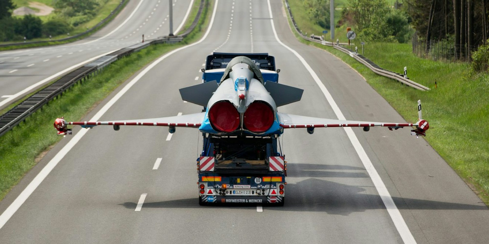Ein Schwertransporter transportiert den Kampfjet vom Typ Eurofighter nach Bayern, wo er repariert werden soll.