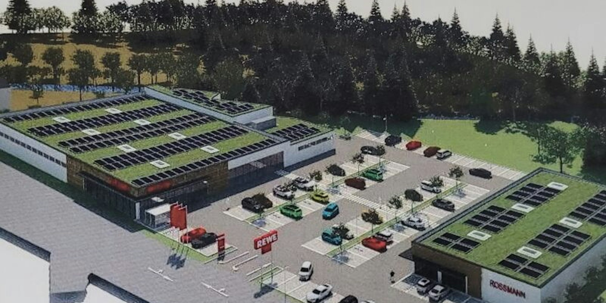 So könnten die Supermärkte von Rewe und die Drogerie „Rossmann“ später aussehen.