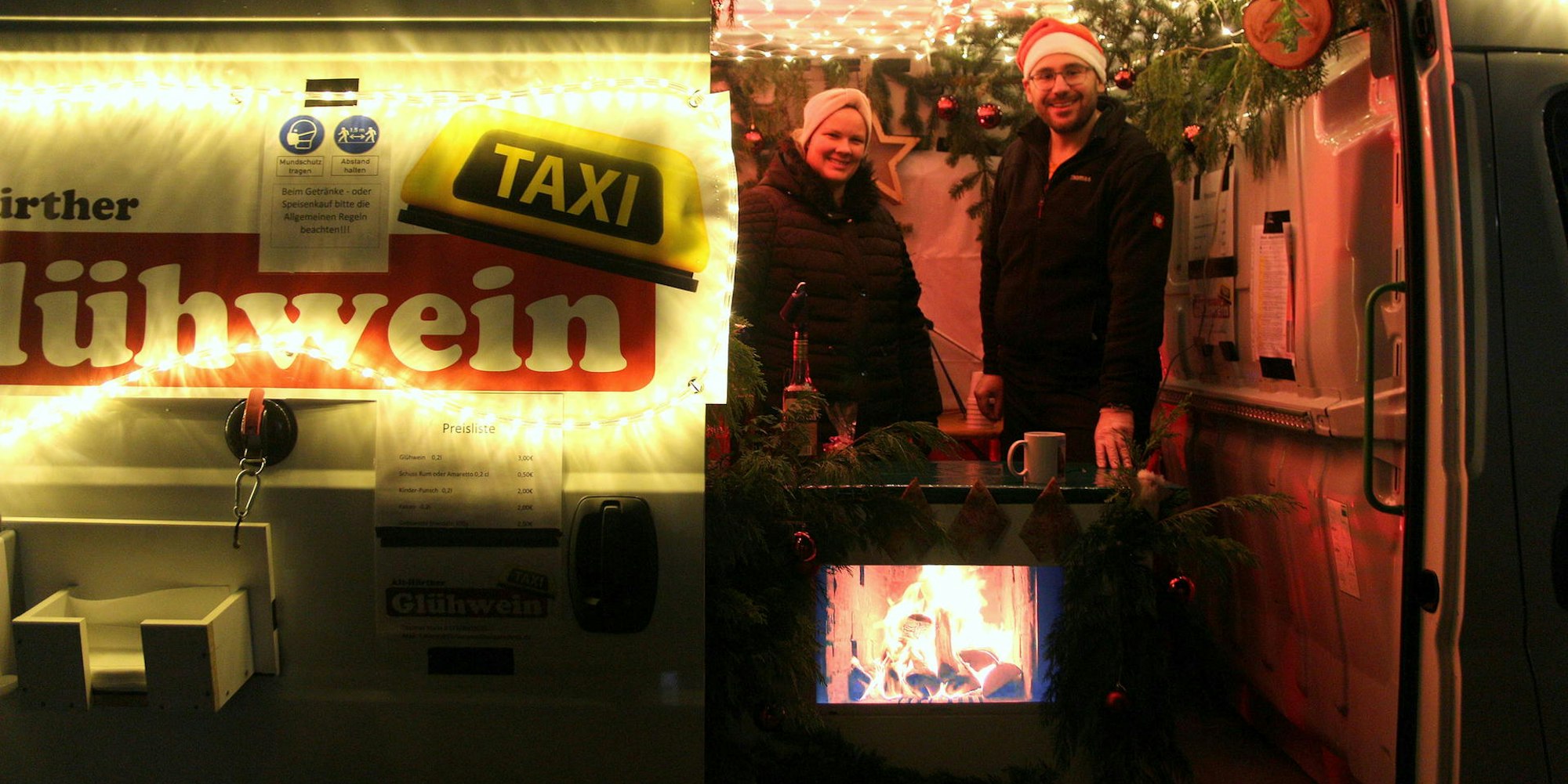 Thomas Horst und Sarah Nicolay-Horst fahren mit dem Glühwein-Taxi auf Bestellung vor.