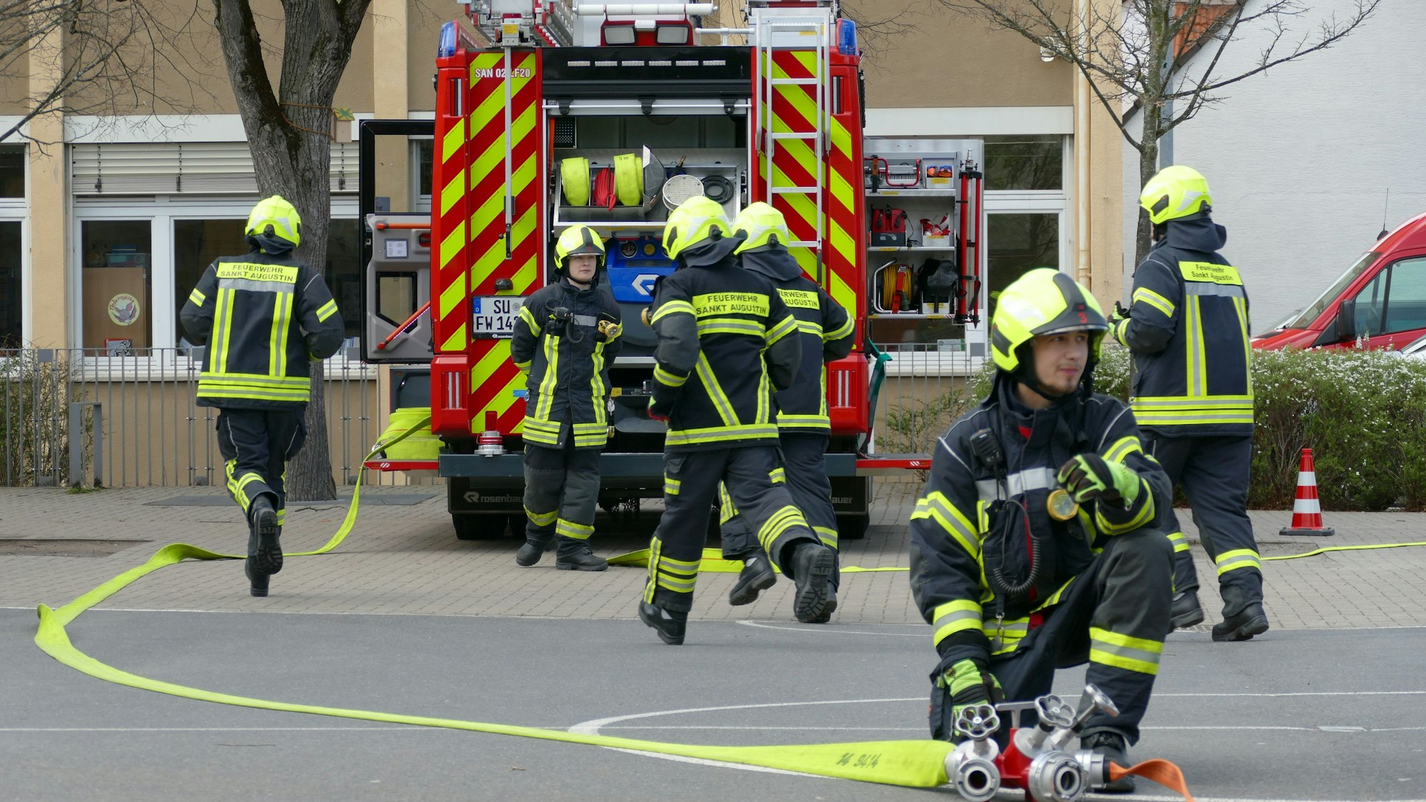 „Einen Teil der Grundausbildung machen die Teilnehmer seit Jahren gemeinsam. Neben Sankt Augustin kommen sie aus Eitorf, Troisdorf, Hennef und Siegburg“, sagte Dennis Schwellenbach, Pressesprecher der Sankt Augustiner Feuerwehr. Dies habe den Vorteil, dass sie sich untereinander besser kennenlernten, weil sie manchmal zu überörtlichen Einsätzen in Nachbarstädte gerufen würden. „Ein Lehrgang mit 75 Feuerwehrleuten ist für eine Kommune allein auch gar nicht zu stemmen, einzelne Module finden deshalb in verschiedenen Städten statt, auch die Ausbilder kommen aus weiten Teilen des Kreises“, fügte er hinzu.