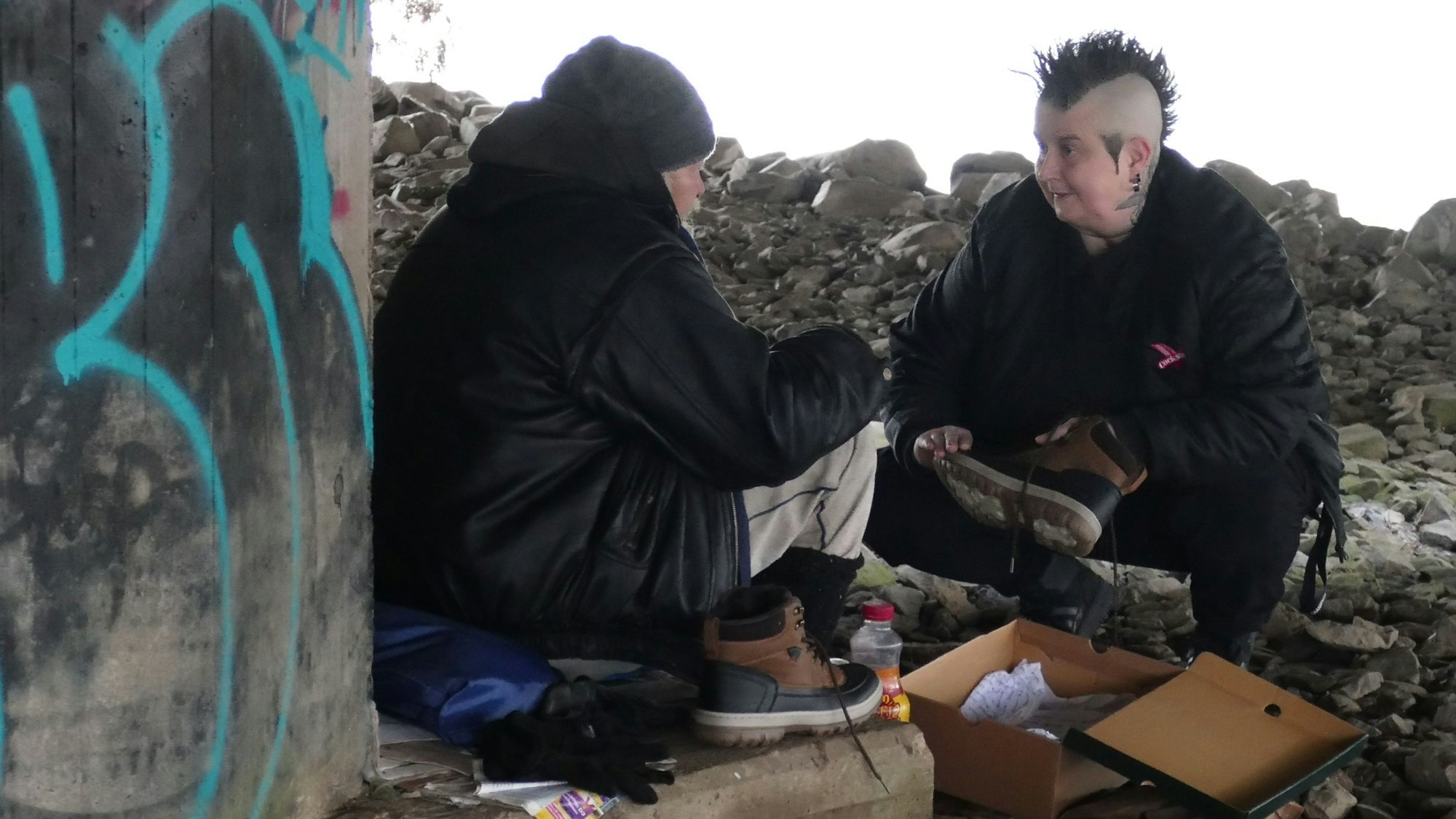 Varressa Lombardi-Boccia bietet dem obdachlosen Mann, der unter der Brücke lebt., neue Schuhe an. Sie passen nicht, sie will andere mitbringen.