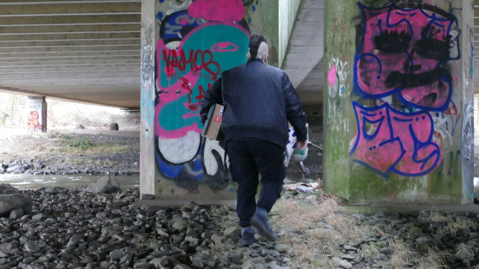 „Mit ihm zu sprechen ist schwierig, er kann nur Polnisch. Wir kommunizieren immer über Handy-Übersetzer.“ Der Mann hockt hinter dem Betonpfeiler. Licht fällt durch den Spalt zwischen den beiden Brückenteilen, neben ihm steht sein mit Taschen und Jacken bepacktes Fahrrad. Aufgeweichte Prospekte liegen um den Mann herum, er sitzt inmitten seiner Fäkalien.