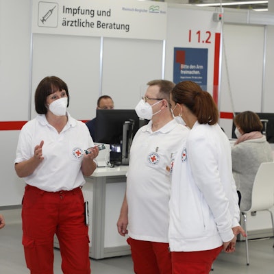 Ein starkes Team: DRK-Kreisvorsitzende Ingeborg Schmidt (M.) mit DRK-Mitarbeitenden am Empfang des Gladbacher Impfzentrums.