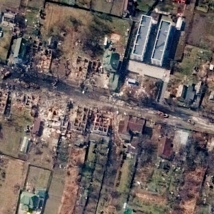 Die „New York Times“ etwa verglich Maxar-Bilder, die Mitte März beim Überfliegen von Butscha entstanden waren, mit Videoaufnahmen von Leichen auf der Straße von Anfang April. Die Positionen der dunklen Flecken, die auf den Satellitenaufnahmen nicht eindeutig als menschliche Körper zu erkennen waren, waren deckungsgleich mit denen der Toten des Videos.