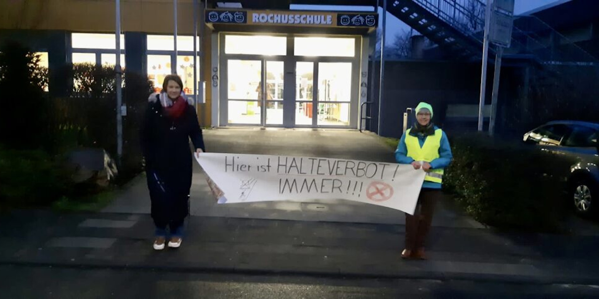 Ute Arnold (l.) und Anne Keller mit einem Banner vor der Rochusschule. Die Verkehrssituation dort ist angespannt.