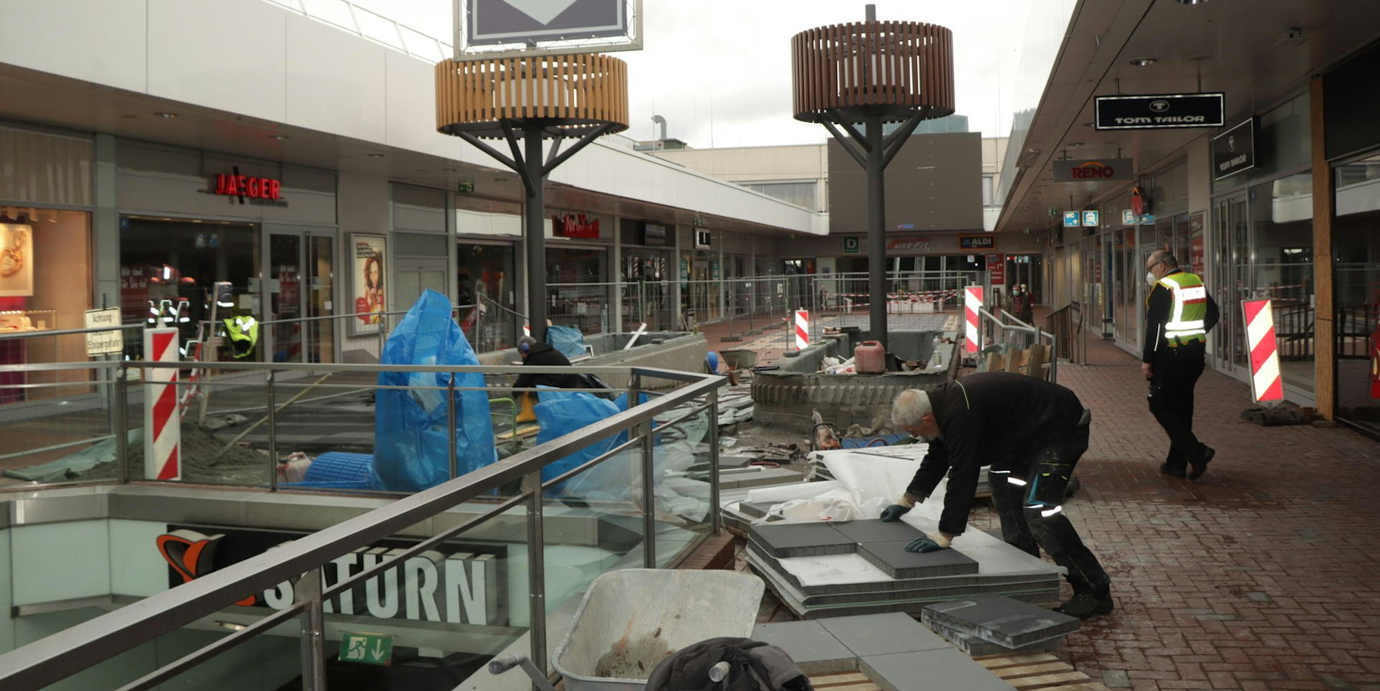 Auf einzelnen Flächen ist das alte rote Pflaster entfernt und durch neue weiße, graue und anthrazitfarbene Steine ersetzt worden. Auch die ersten großen mit Holz verkleideten Lampen, die zum Beispiel die Wege der Ladenstraße künftig erhellen und verschönern sollen, sind bereits montiert. Zusätzliche Lampen sollen im Boden verbaut werden. „Das wird schon sehr attraktiv aussehen“, ist Centermanager, Enver Savkay überzeugt. „Und wir liegen gut in der Zeit“, gibt er sich zuversichtlich.
