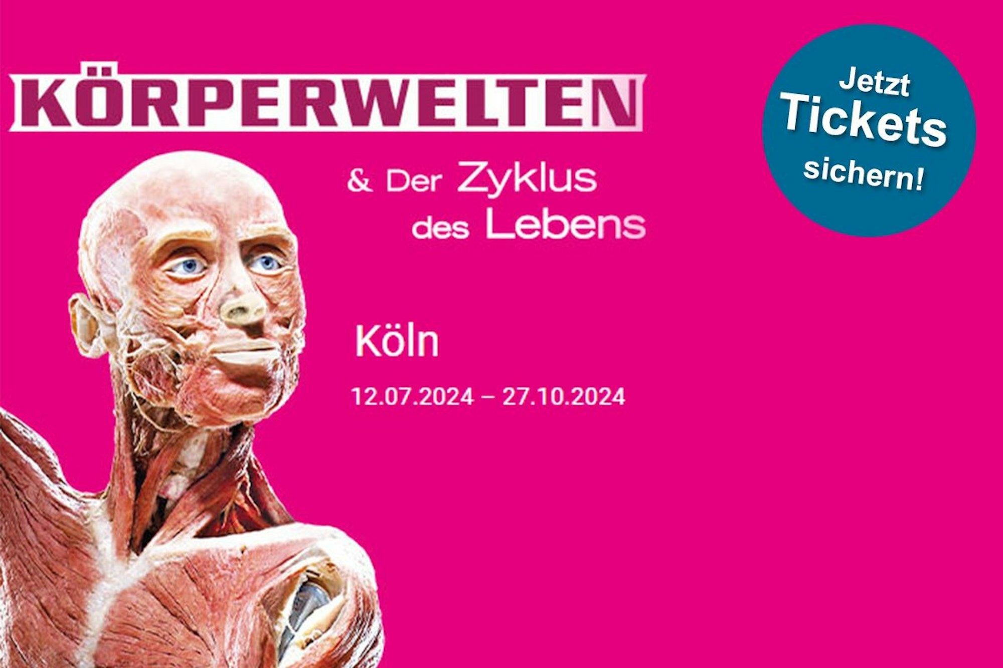 Die Ausstellung „KÖRPERWELTEN & Der Zyklus des Lebens“ in Köln Ehrenfeld bietet unvergessliche Einblicke in die Anatomie und Funktionsweise des menschlichen Körpers. Ob Sie wissenschaftliches Interesse haben, einen lehrreichen Familienausflug planen oder einfach nur neugierig sind – diese Ausstellung wird Sie begeistern und Ihre Sicht auf das Leben tiefgreifend verändern. Verpassen Sie nicht die einmalige Gelegenheit, die Wunder des menschlichen Körpers hautnah zu erleben! Diese Schau verändert unseren Blick auf uns selbst und unsere Lebensweise. Weltweit haben sich bereits über 55 Millionen Menschen auf diese spannende Reise begeben.