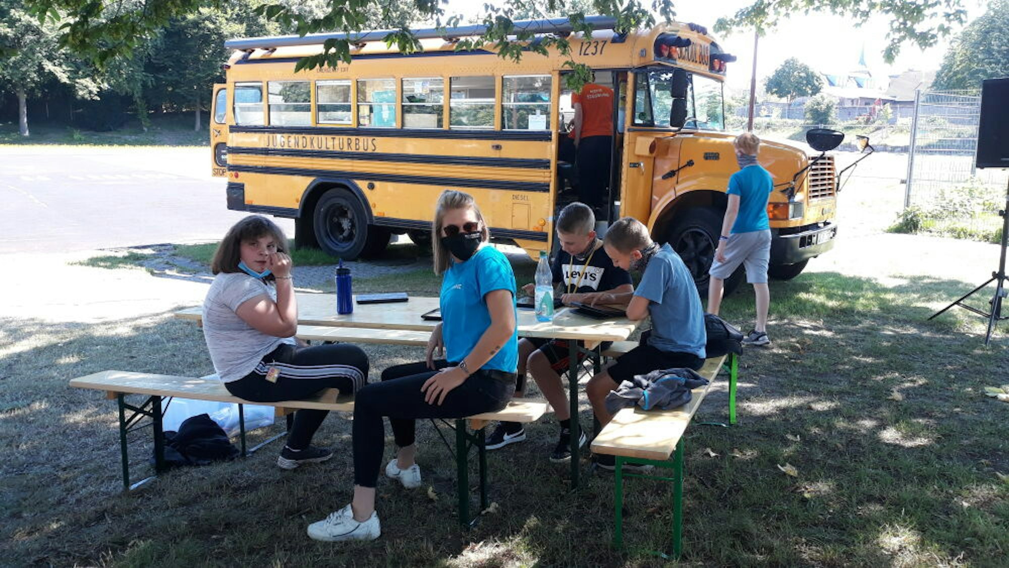 In dem gelben Jugendkulturbus produziert das Medienteam eine tägliche Radiosendung. Einen Musikwunsch erfüllt die Radioredaktion für sechs „Siegis“.