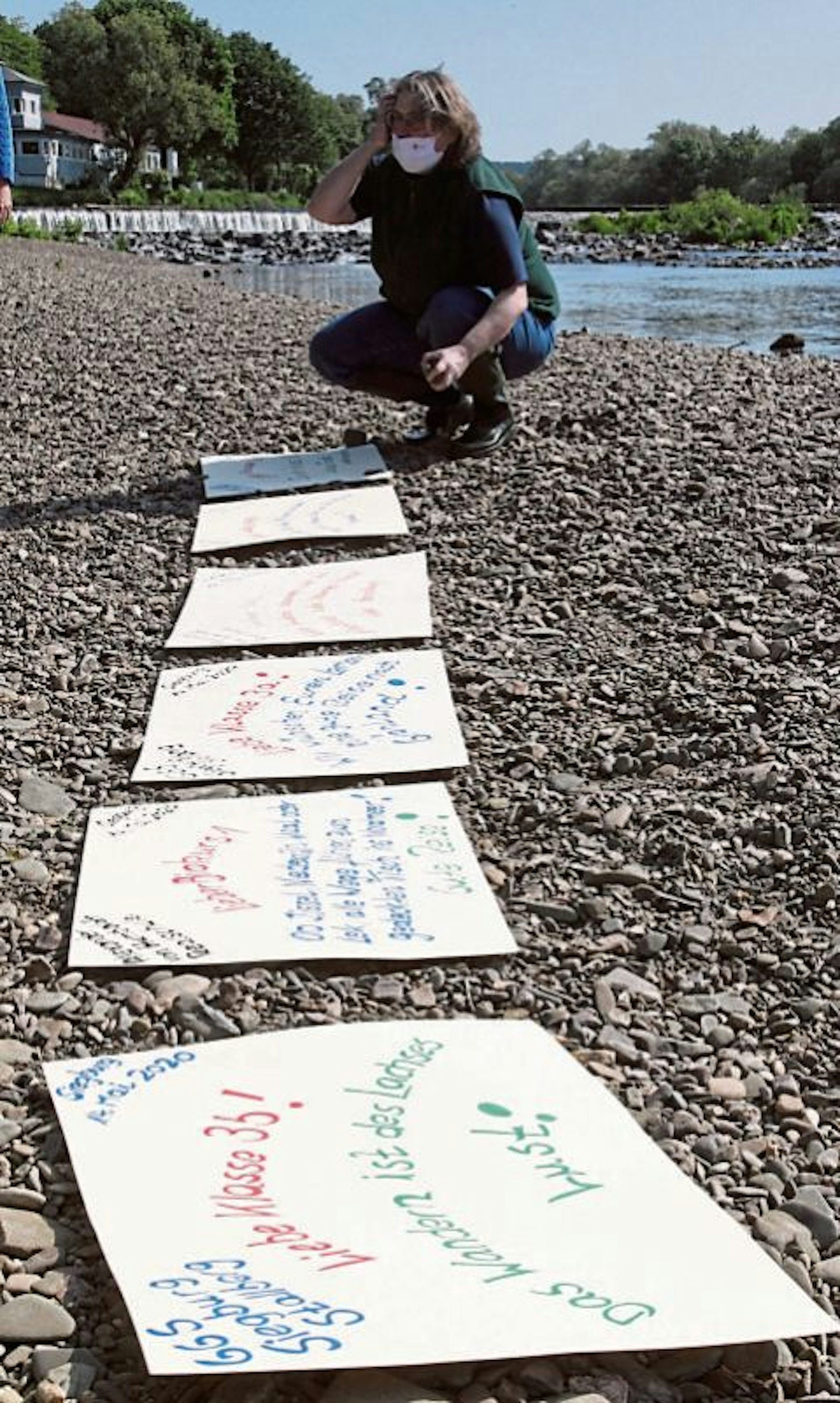 Wasserlauf-Mitarbeiterin Marion Meitzner legte Plakate aus, die für Schüler beschriftet wurden.