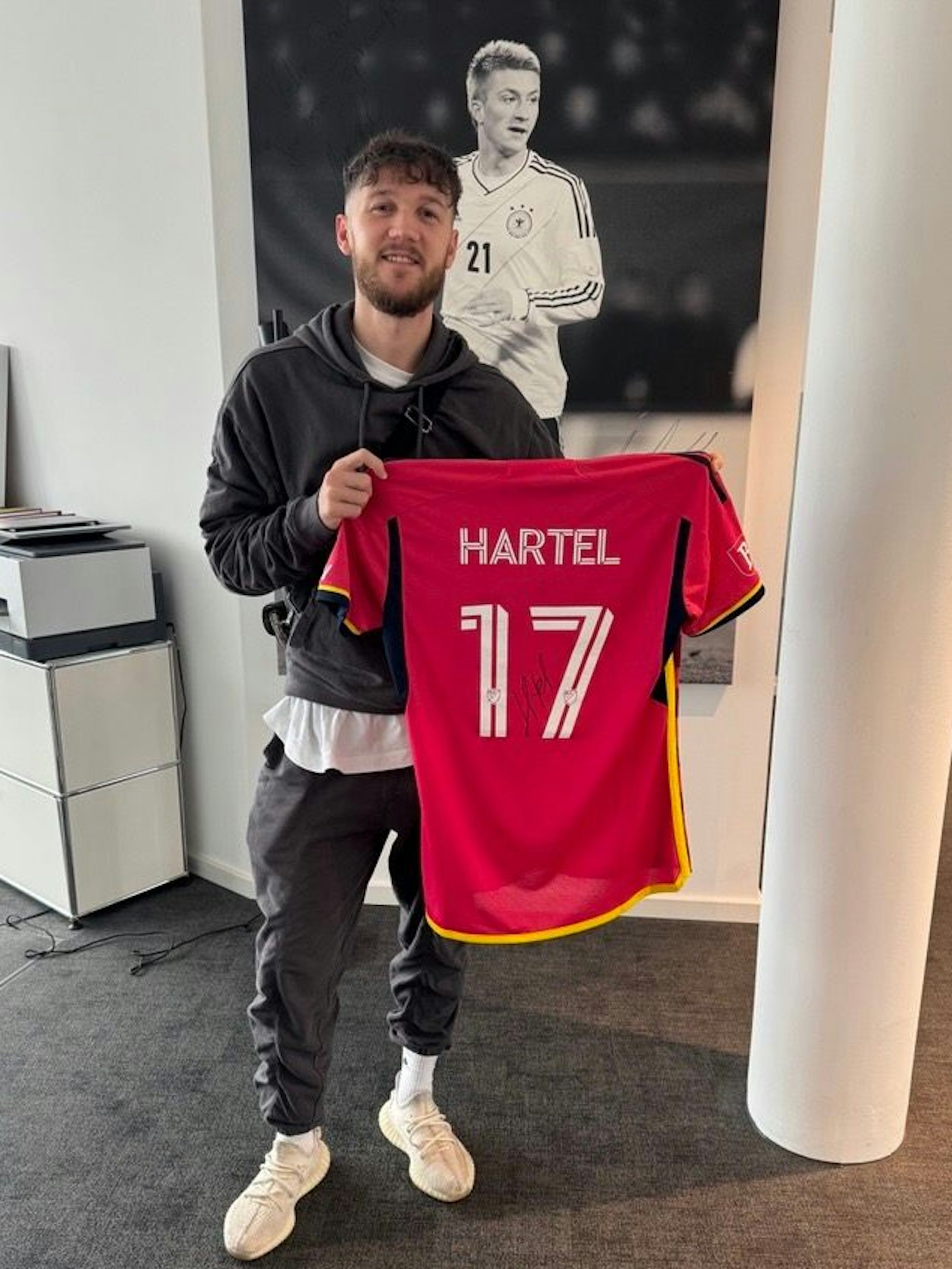 Zu Besuch in Köln: Marcel Hartel posiert mit dem Trikot von St. Louis City. Sein Kumpel Marco Reus (auf dem Poster im Hintergrund) holte jüngst mit LA Galaxy die Meisterschaft in der MLS.