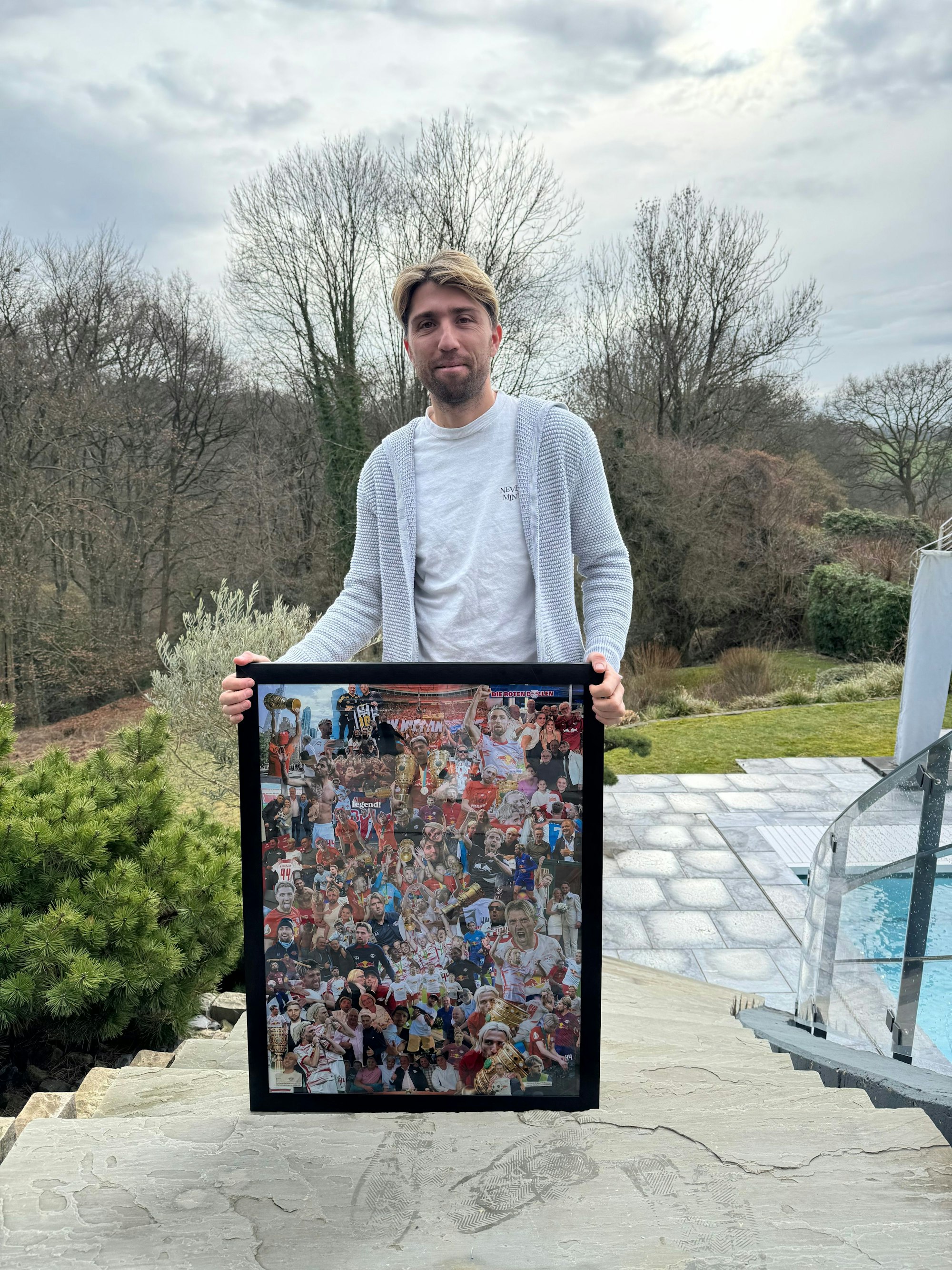 Rückkehr ins Rheinland: Kevin Kampl daheim in Solingen. Er zeigt eine Collage mit Stationen seiner langen Karriere, die ihn zum Laufbahnende sein langjähriger Berater und Freund Michael Ruhnau geschenkt hat.