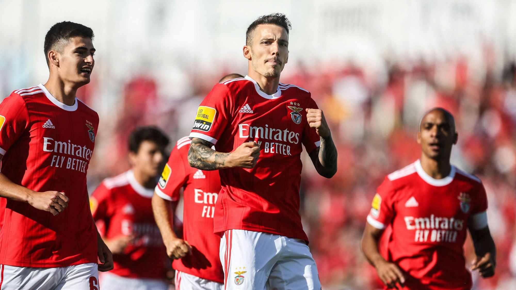 Alex Grimaldo (Mitte) bejubelt ein Tor für Benfica.