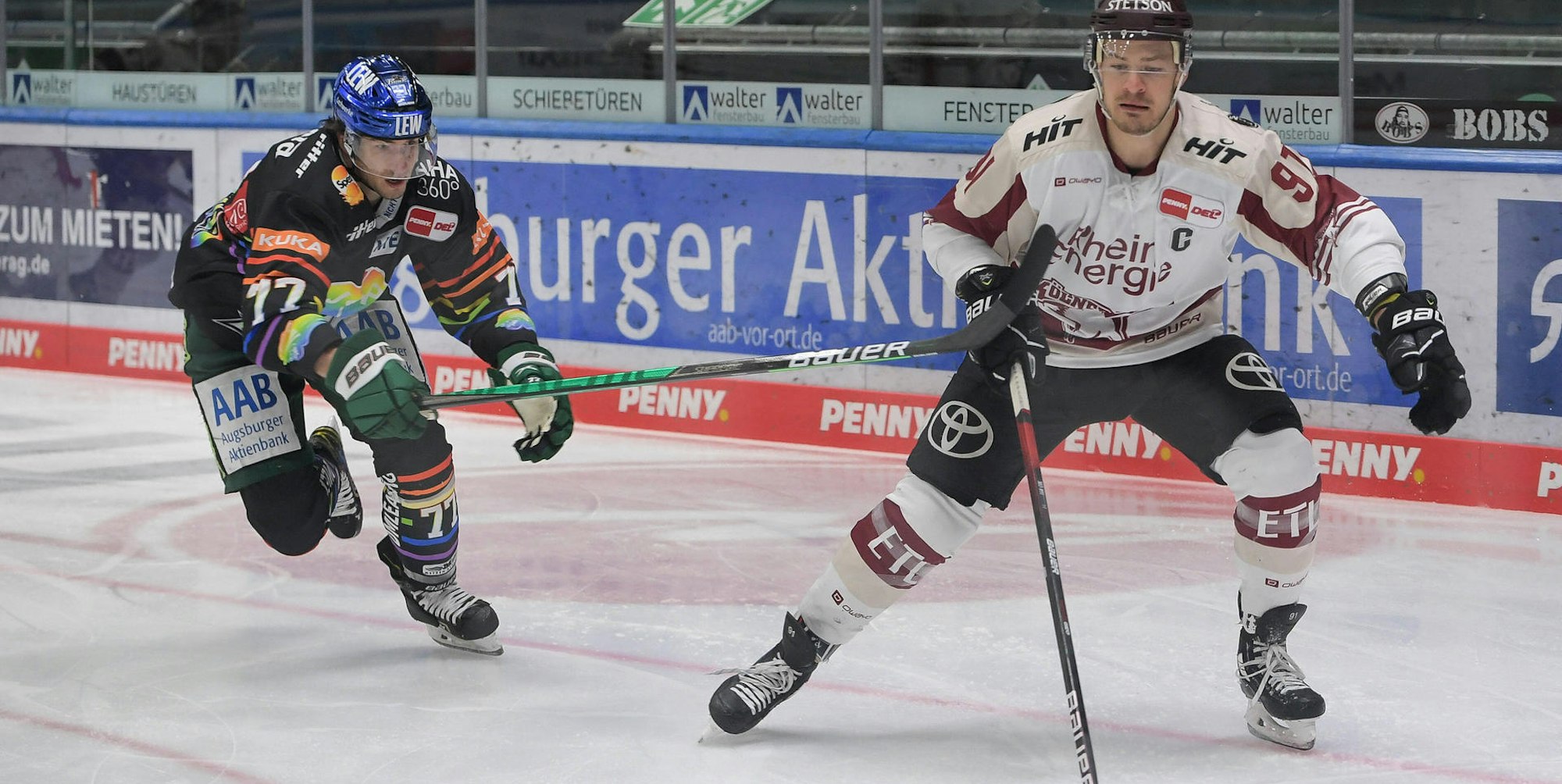 Zweikampf mit links Jaroslav Hafenrichter von den Augsburger Panthern und Moritz Müller von den Kölner Haien.