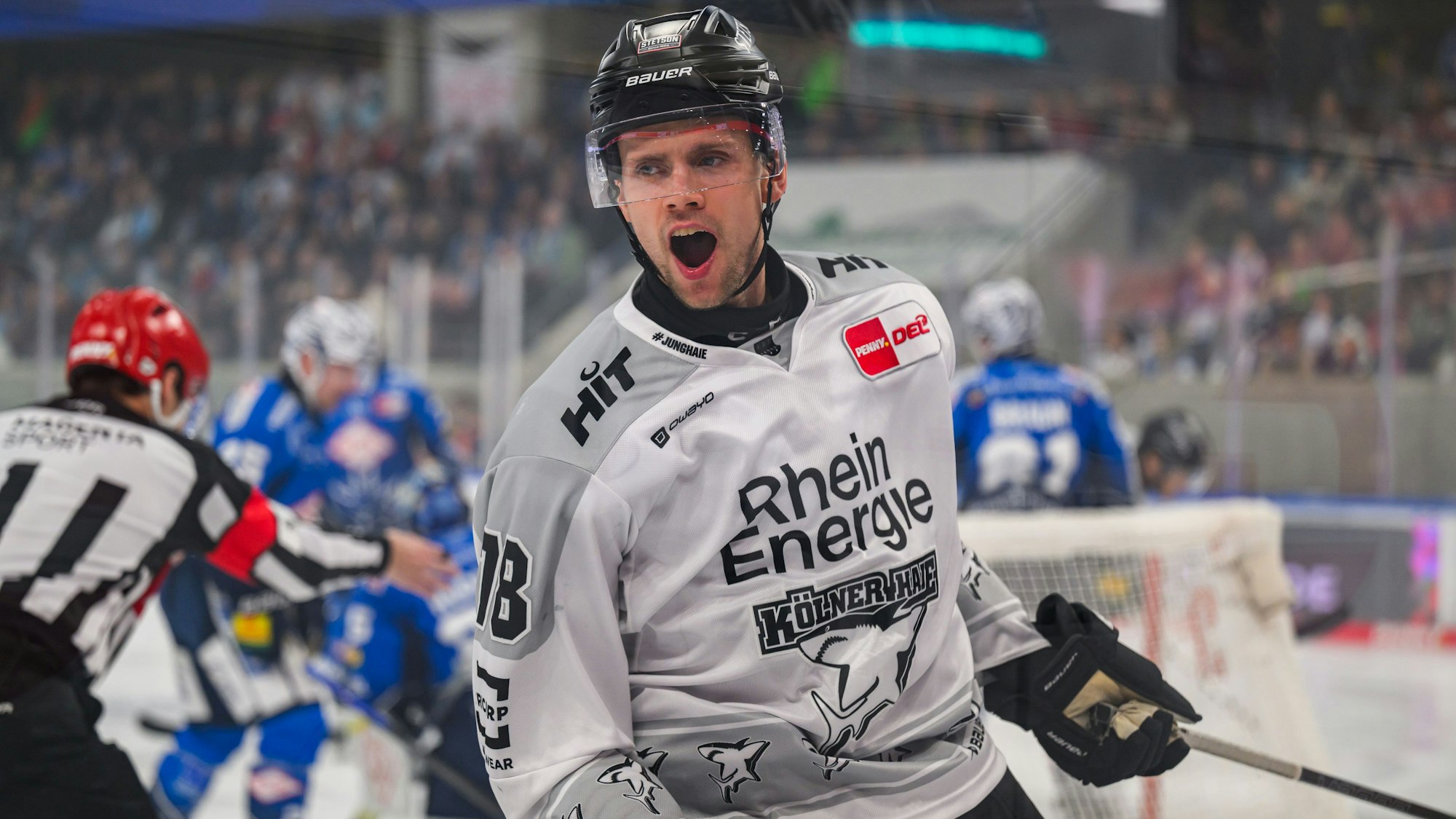 Dominik Bokk (Kölner Haie) jubelt nach seinem Tor zum 0:1 gegen Dresden im Oktober