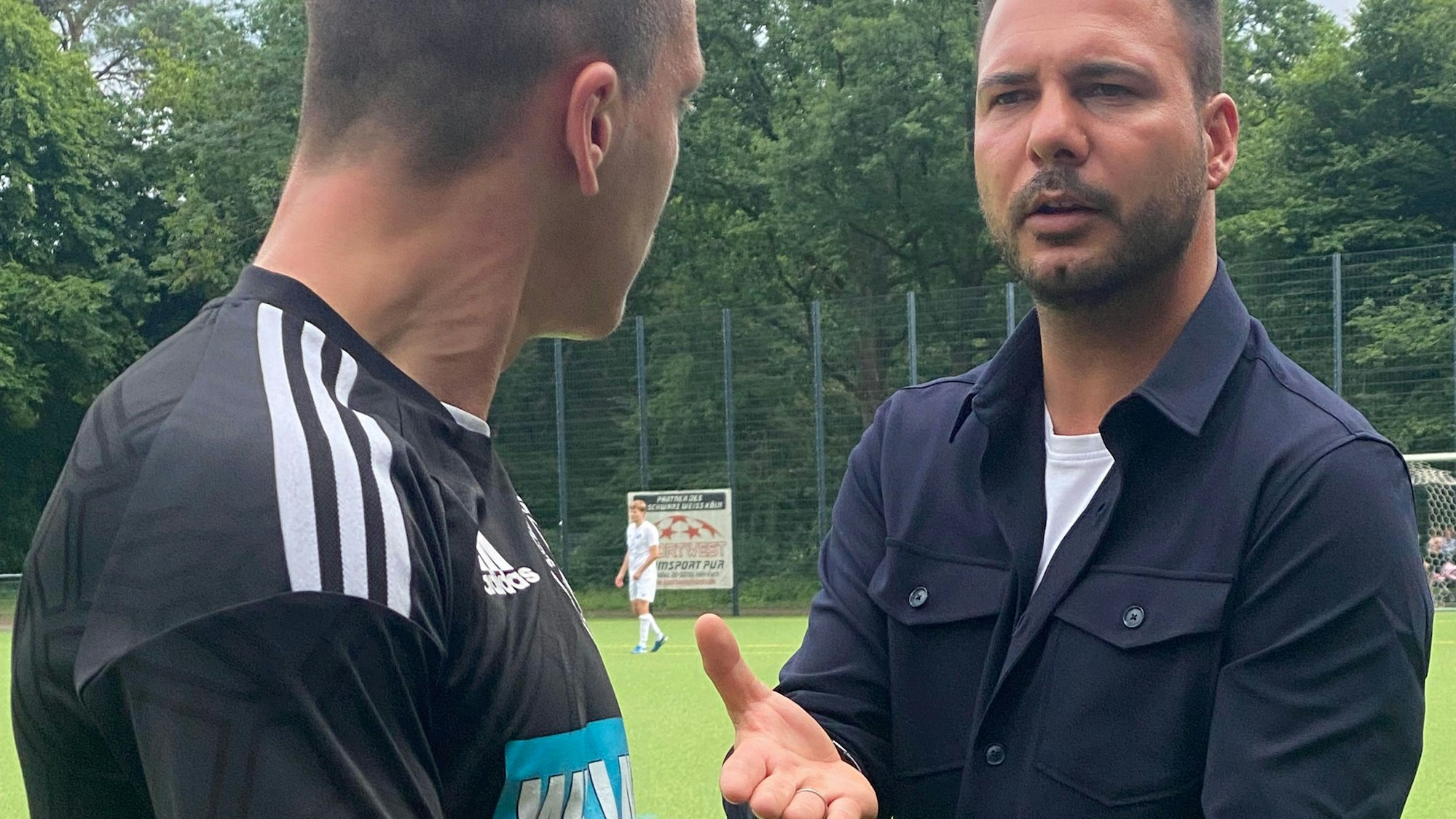 Ricky Fritzen (l.) von Schwarz-Weiß Köln nach seinem Platzverweis mit Raffaelo Wolf, Sportlicher Leiter von Blau-Weiß Köln.