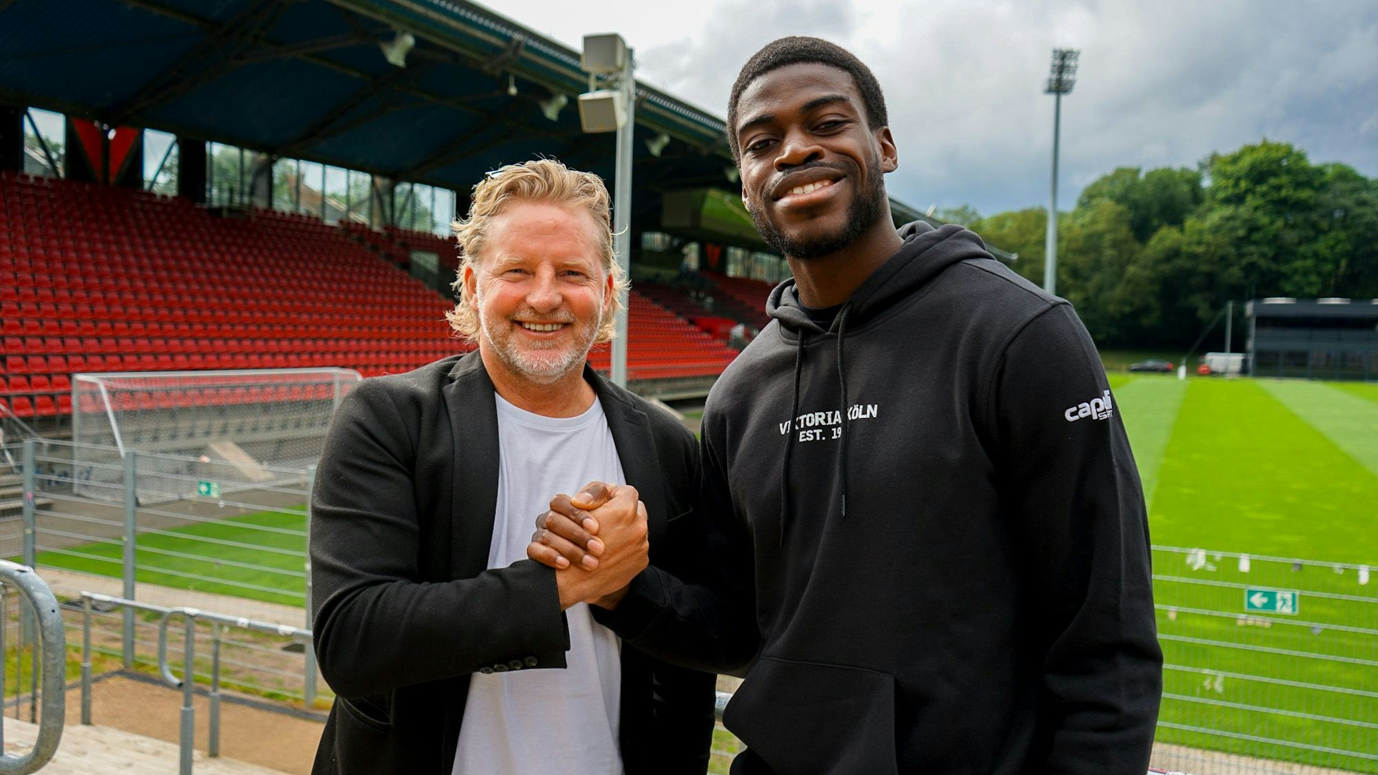 Stephan Küsters (links) mit Kwabe Schulz, Neuzugang des FC Viktoria Köln.