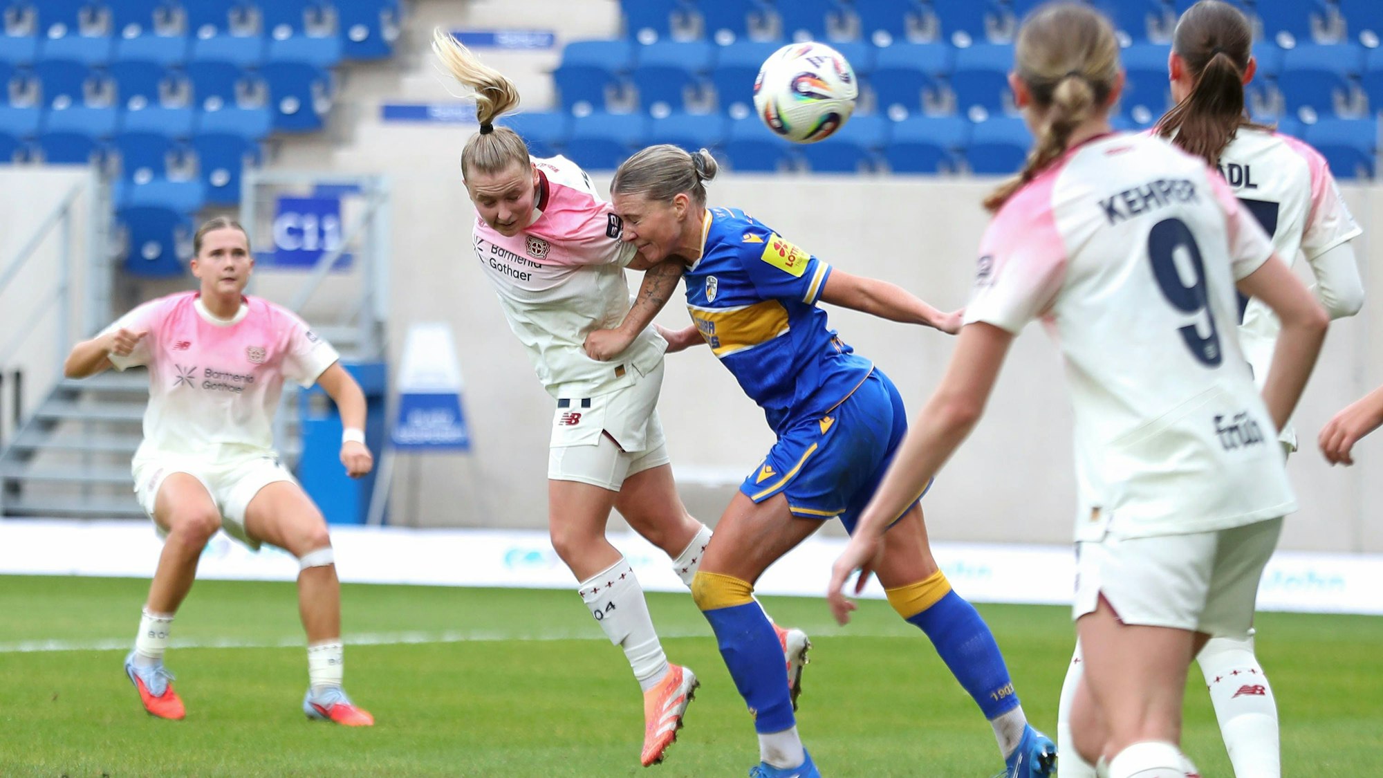 Vanessa Fudalla (links beim Kopfball) traf für Bayer 04 in Jena.