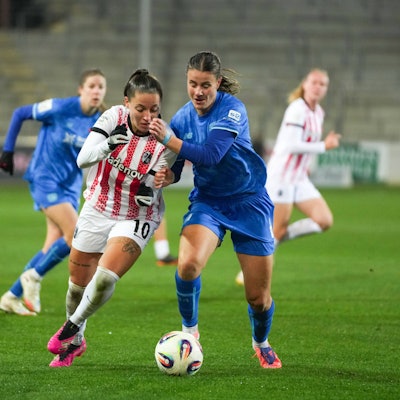 Begonnen hatte die Partie noch deutlich entspannter. Bayer-Keeperin Nummer drei Anne Moll, die für die verletzten Friederike Repohl und Charlotte Voll im Tor stand, hatte zunächst wenig zu tun. Chancen besaß nur ihre Elf. Eine Flanke von Estrella Merino Gonzalez landete bei Kristin Kögel, deren Kopfball aber die Wucht fehlte (3.). Zwei Minuten später probierte es die Kapitänin erfolglos aus der Distanz, ehe Sofie Zdebel nach einer Eckball-Variante aus dem Rückraum an Torhüterin Larissa Haidner scheiterte (7.).