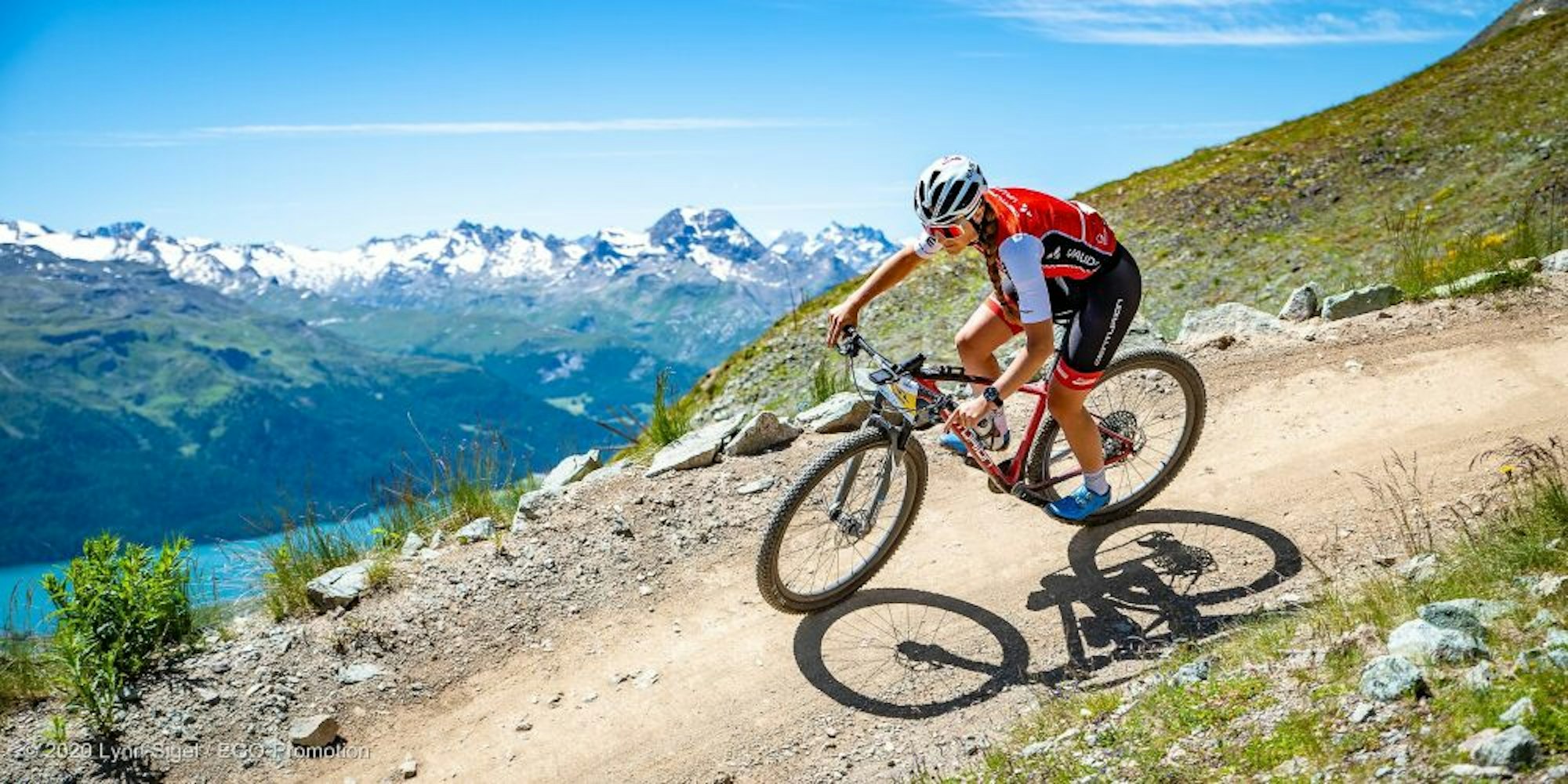 Stefanie Dohrn beim Etappenrennen Engadin Bike Giro in den Schweizer Alpen.