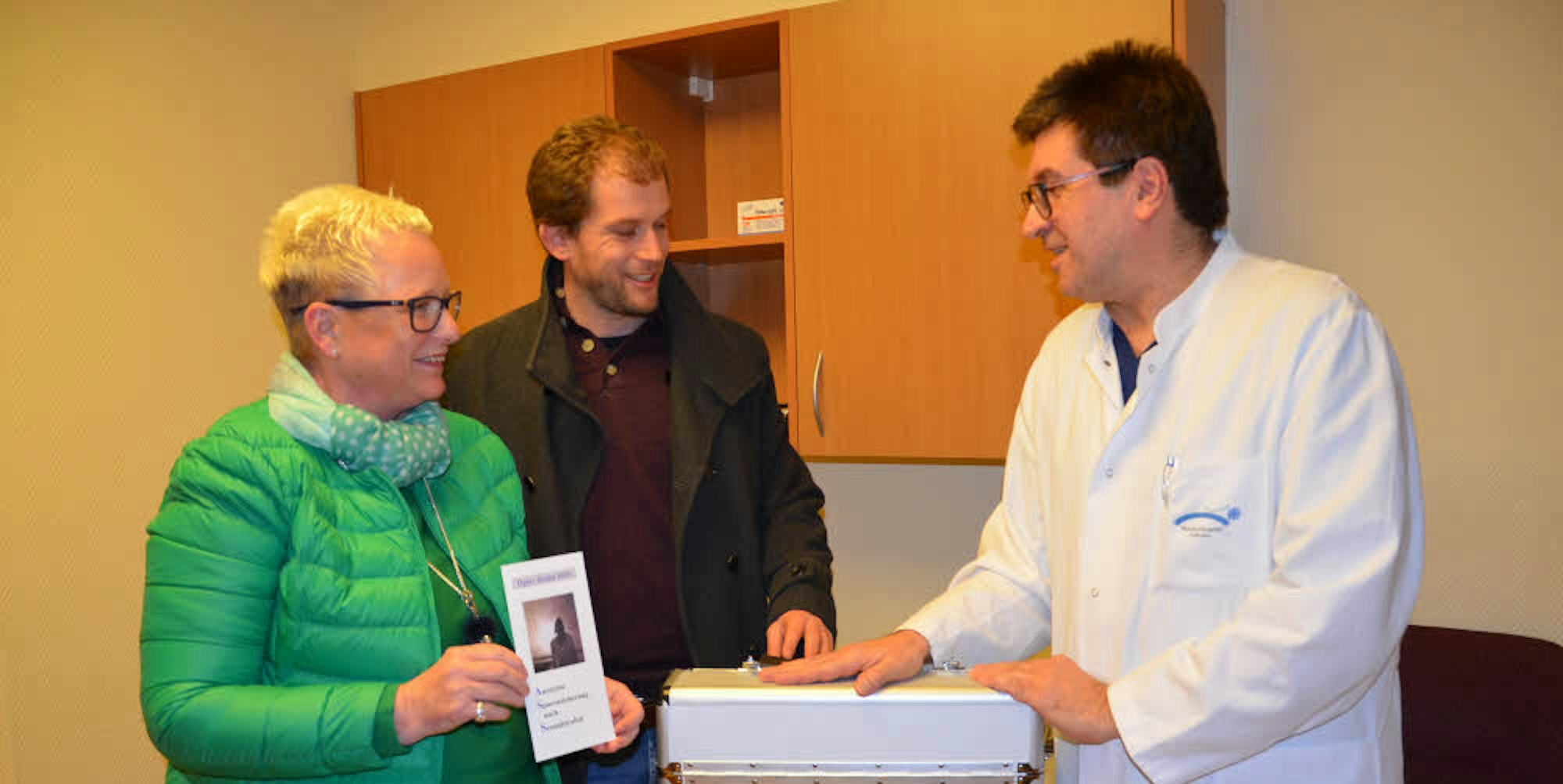 Je einen ASS-Koffer übergaben Anke Sefrin (v.l.) und Lars Mechler vom Opfernetzwerk an das Marien-Hospital Euskirchen und das Kreiskrankenhaus Mechernich, hier an den Chefarzt der Gynäkologie am Marien-Hospital, Jacek Goldzinski.