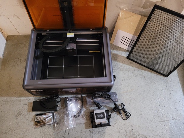 Das Gerät kommt in einem stabilen Karton, zusätzlichen Schaumpolstern und gut sortiertem Zubehör, darunter ein Werkzeugset, einige Basswood-Proben, ein Abluftschlauch für die Belüftung sowie eine Air-Assist-Einheit. Die beiliegende Kurzanleitung ist bebildert und sprachlich klar gehalten, wobei manche Sicherheitsdetails ausführlicher sein könnten; dennoch reicht die Dokumentation für einen raschen Einstieg aus. Die Verpackung und Sortierung der Teile wirken durchdacht und erleichtern das erste In-Kontakt-Treten mit dem System.