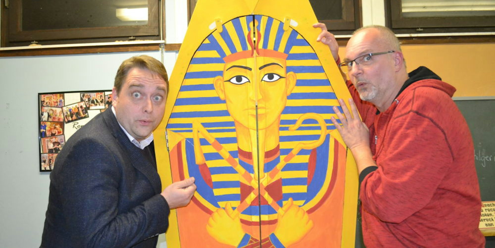 Beste Voraussetzungen für knapp zwei Stunden unbeschwerten Spaß, der übrigens nicht von populären Fernsehsendungen wie „Bares für Rares“ inspiriert worden sei, betonte die Vereinsvorsitzende Waltraud Rosenbaum: „Das ist bei uns nur Vorlage für eine Pointe.“ Abgerundet wird die Inszenierung durch spritzige Musikeinlagen, die ebenfalls Regisseurin Petra Sandow einstudiert hat. Ein Hingucker ist auch das Bühnenbild: So wird Tutomi standesgemäß ein prächtiger Sarkophag spendiert, der von Sandra Lis gestaltet wurde.