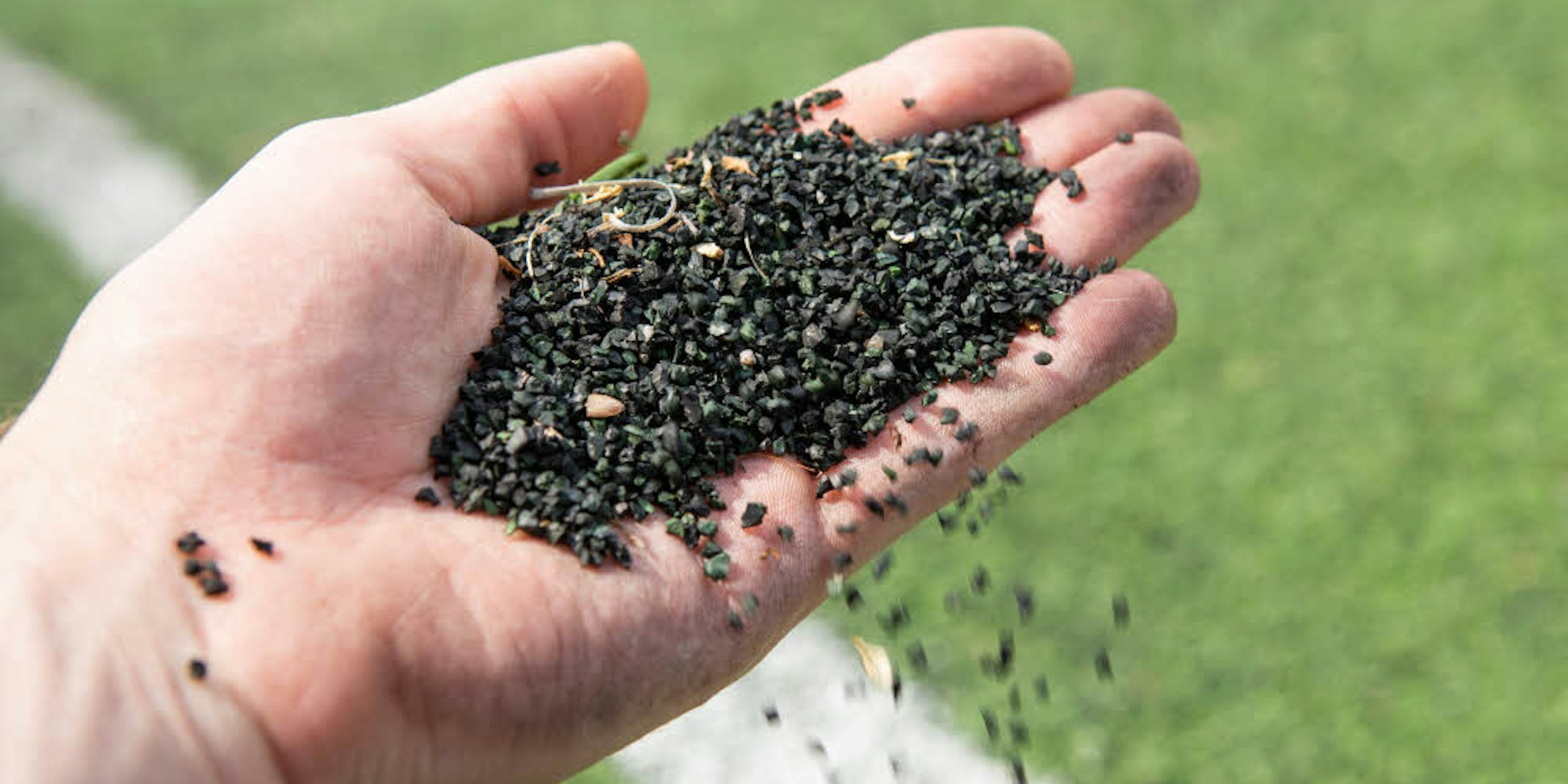 Das Problem: Rund 60 bis 65 Tonnen Einstreumaterial lagern auf einem einzigen Kunstrasenplatz. Und ohne das Streumaterial geht es nicht: Die Körner sind wichtig für das Rollverhalten von Bällen, auch sorgen sie dafür, dass der Abrieb geringer wird, die Plätze länger halten. Wichtigster Grund für das Granulat: Sportler werden dank der Körner vor Verletzungen geschützt, weil die Plätze sonst ziemlich „stumpf“ wären, man viel leichter umknickt.