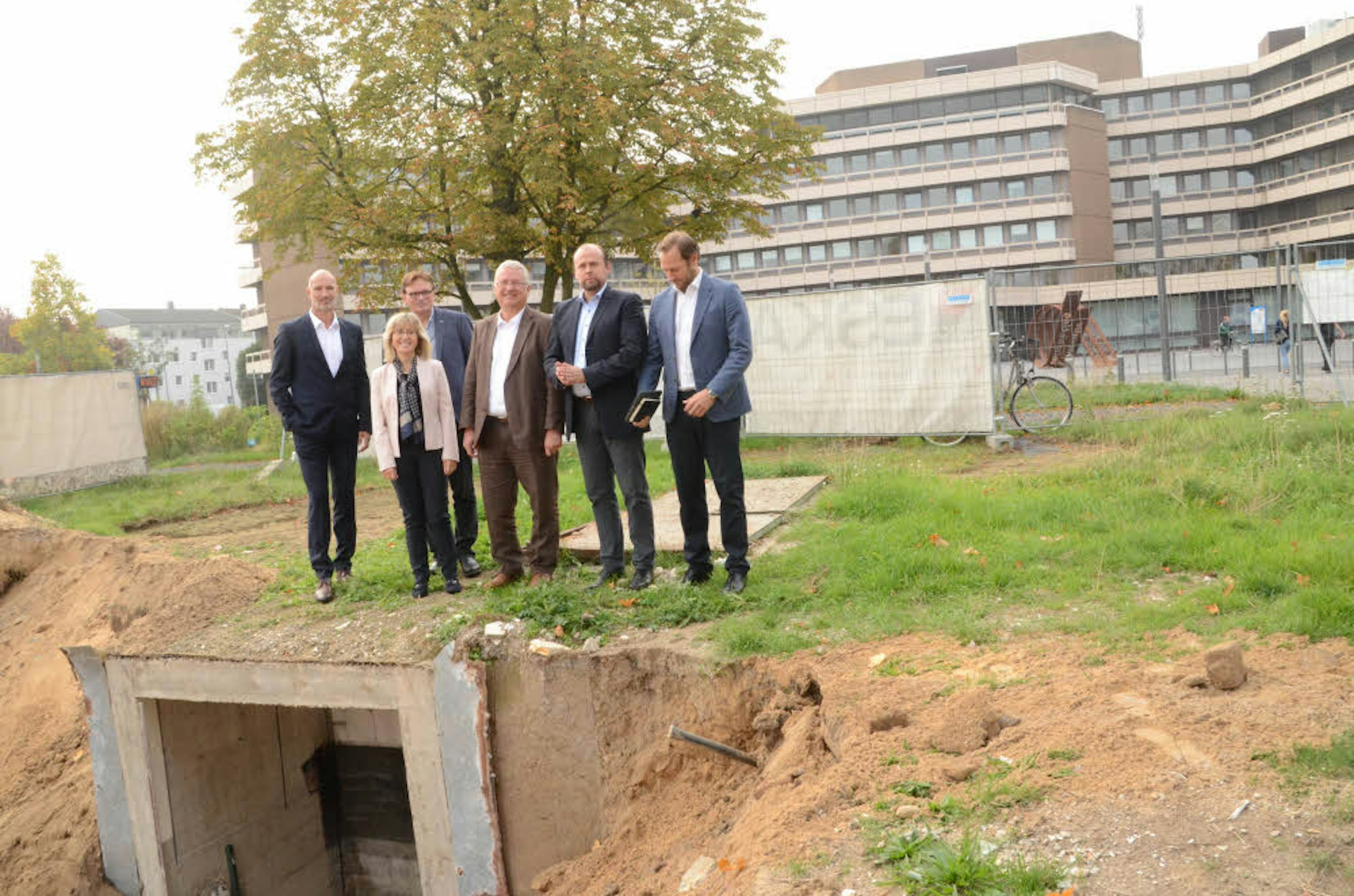 Am Bauplatz gegenüber dem Rathaus: (von rechts) Tim Zeichhardt, Sascha Konter, Bürgermeister Klaus-Werner Jablonski, Thomas Radowski sowie Andrea Vogt und Jens Hülstede (Troikomm).