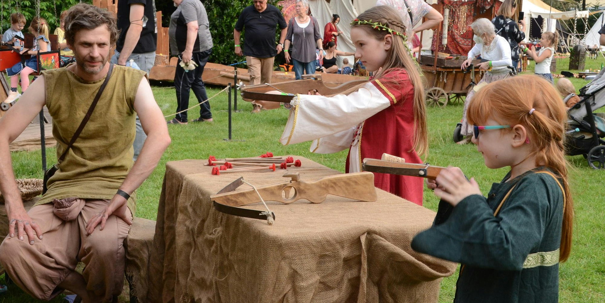 Begeistert vom Mittelalter: Die siebenjährige Lotti aus Königswinter und ihre neunjährige Schwester Lilly übten sich im Armbrustschießen.