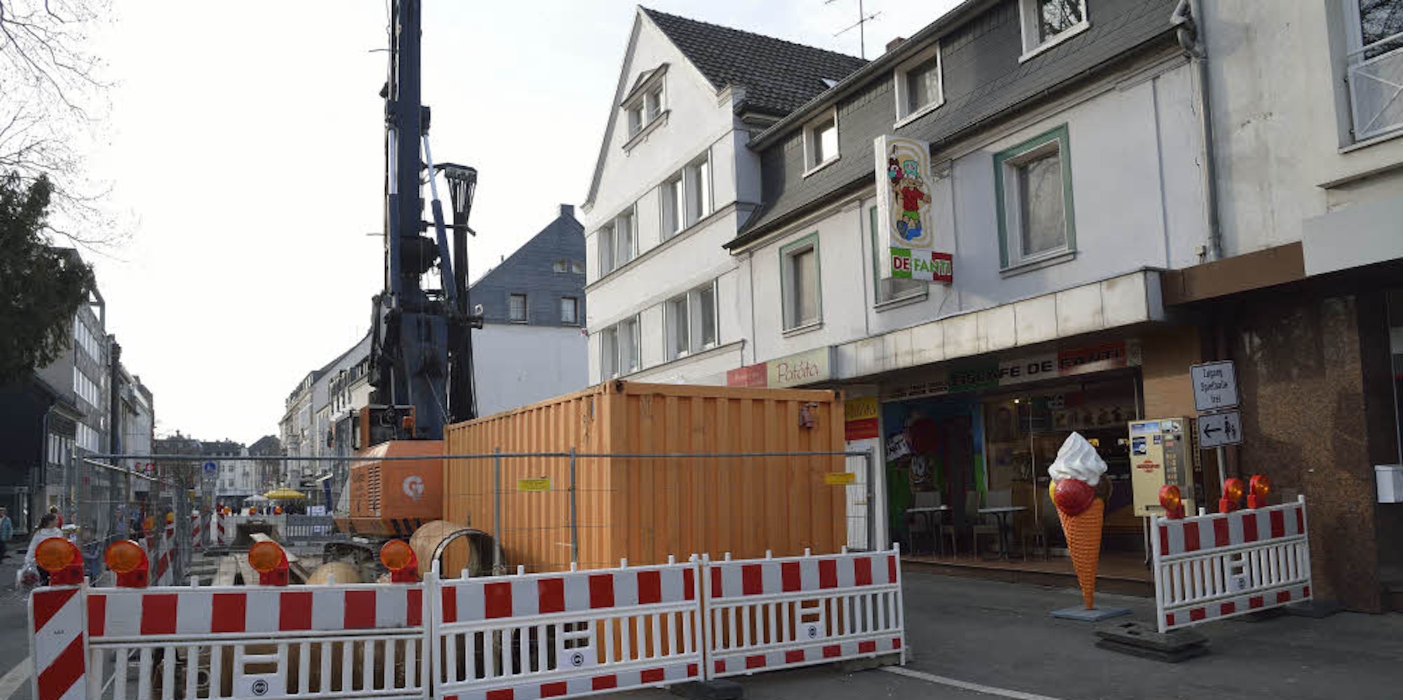 Die Eisdiele ist hinter dem Baucontainer kaum zu sehen. Ein mächtiger Bohrer macht einen ohrenbetäubenden Lärm.