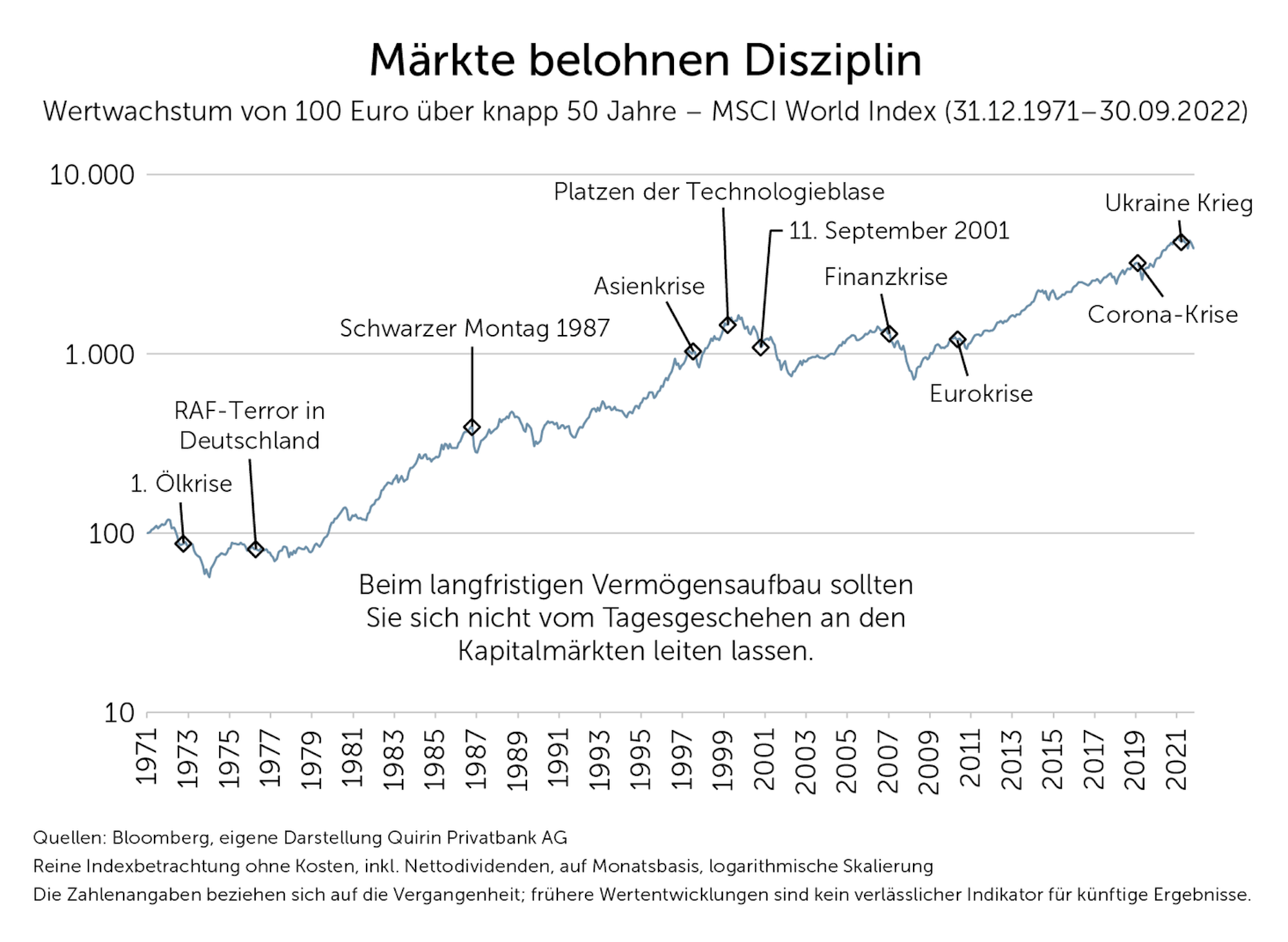 Oft sagen Anleger auch, der Einstieg sei jetzt viel zu riskant. Das höre ich übrigens sowohl, wenn die Märkte oben, als auch, wenn sie unten stehen. Dazu zitiere ich gerne unseren Chefvolkswirt: