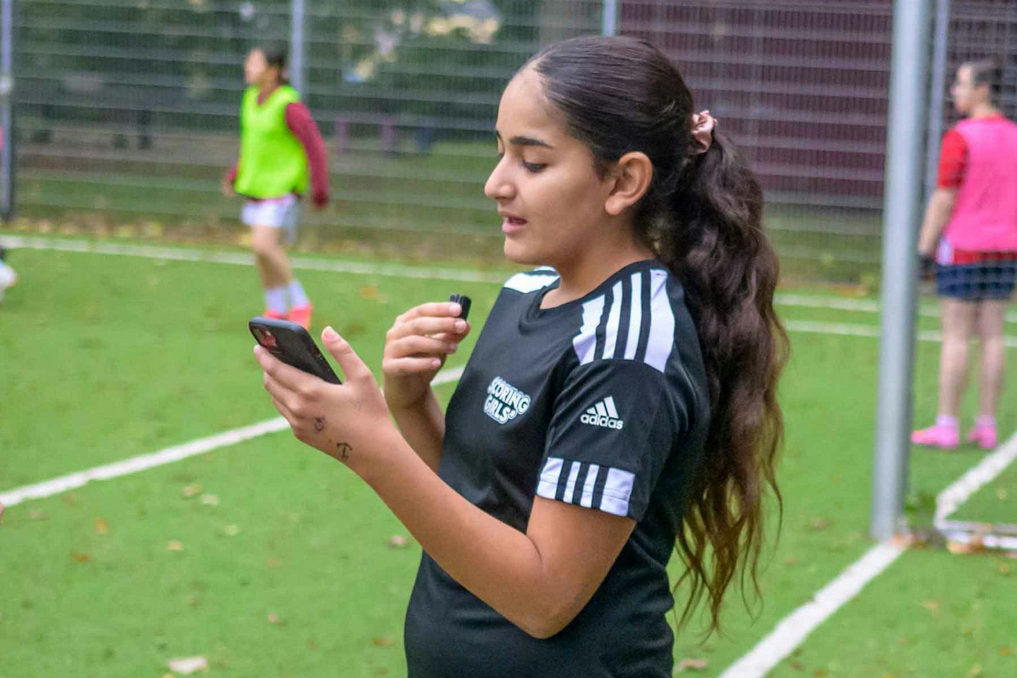 Auch Rebecca, 13, ist Teil der Gruppe. Seit zwei Jahren besucht sie das kostenlose Training, Workshops, Ausflüge und Ferienprogramme. Im Mai durfte sie mit zwei weiteren Mädchen* beim Champions-League-Finale in München mit den Schiedsrichtern einlaufen – ein Moment voller Aufregung und Stolz. „SCORING GIRLS* ist so besonders, weil man dazugehört“, sagt sie. „Wenn jemand einen Fehler macht, helfen wir uns gegenseitig. Ich habe hier Zusammenhalt und Hilfsbereitschaft gelernt.“