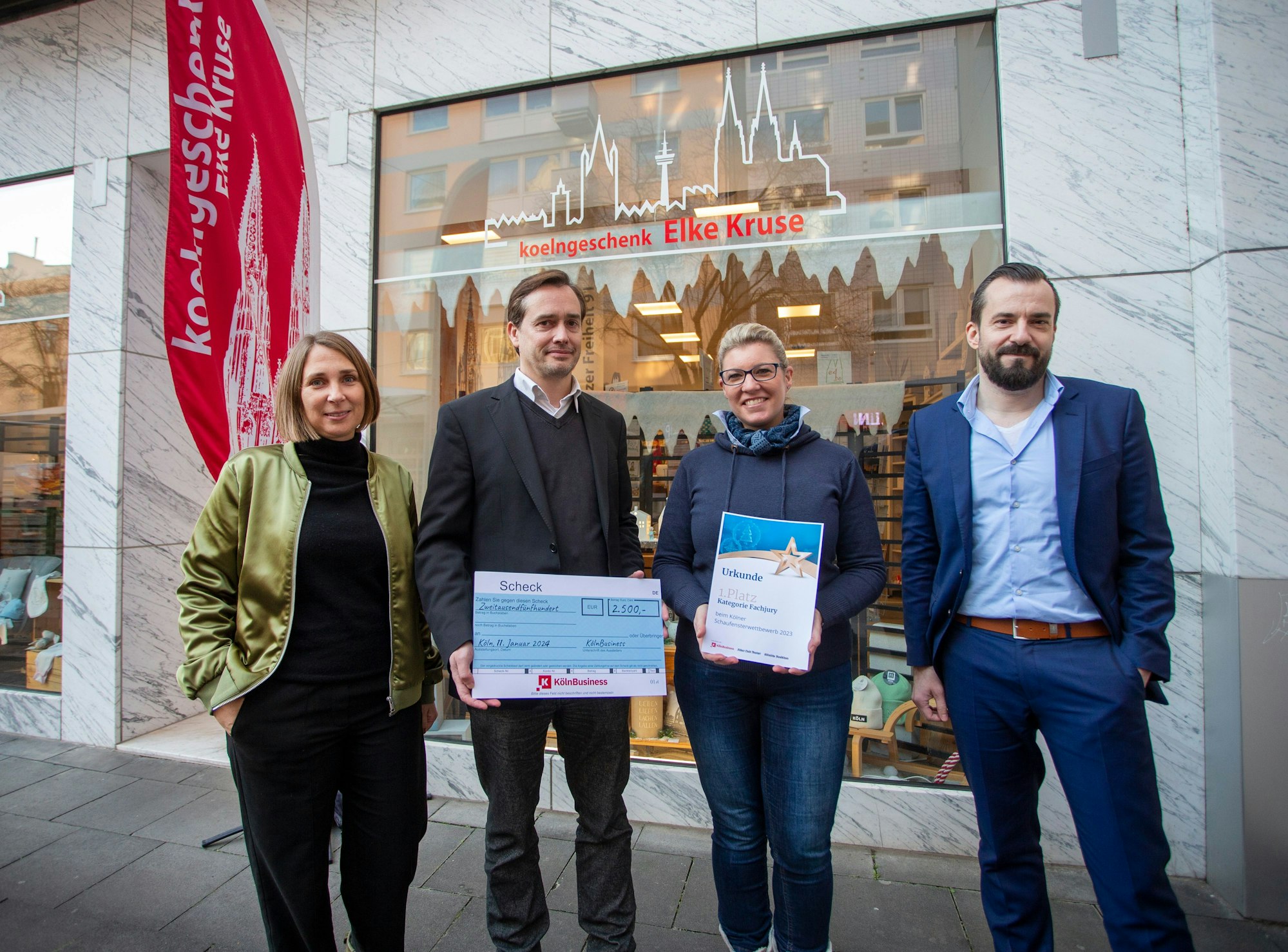 Christina Rothfeld (KölnBusiness Marketing), Holger Leroy (KölnBusiness, Team Einzelhandel), Sandra Embgenbroich (koelngeschenk Elke Kruse) und Oliver Siegert (Leitung Werbevermarktung Kölner Stadt-Anzeiger Medien) bei der Übergabe des Jurypreises.