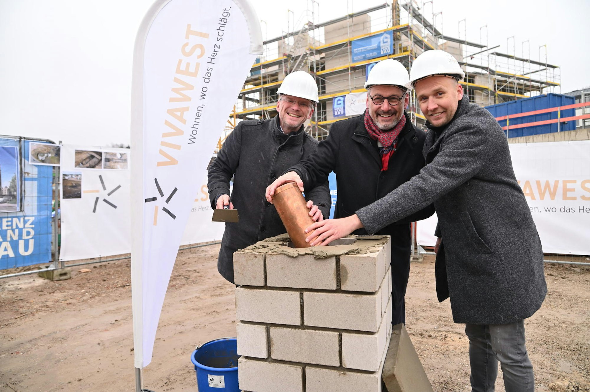 Frank Stein, Uwe Eichner (Vivawest) und Marco Körkemeyer (Grenzland-Bau) bei der Grundsteinlegung (v.l.).