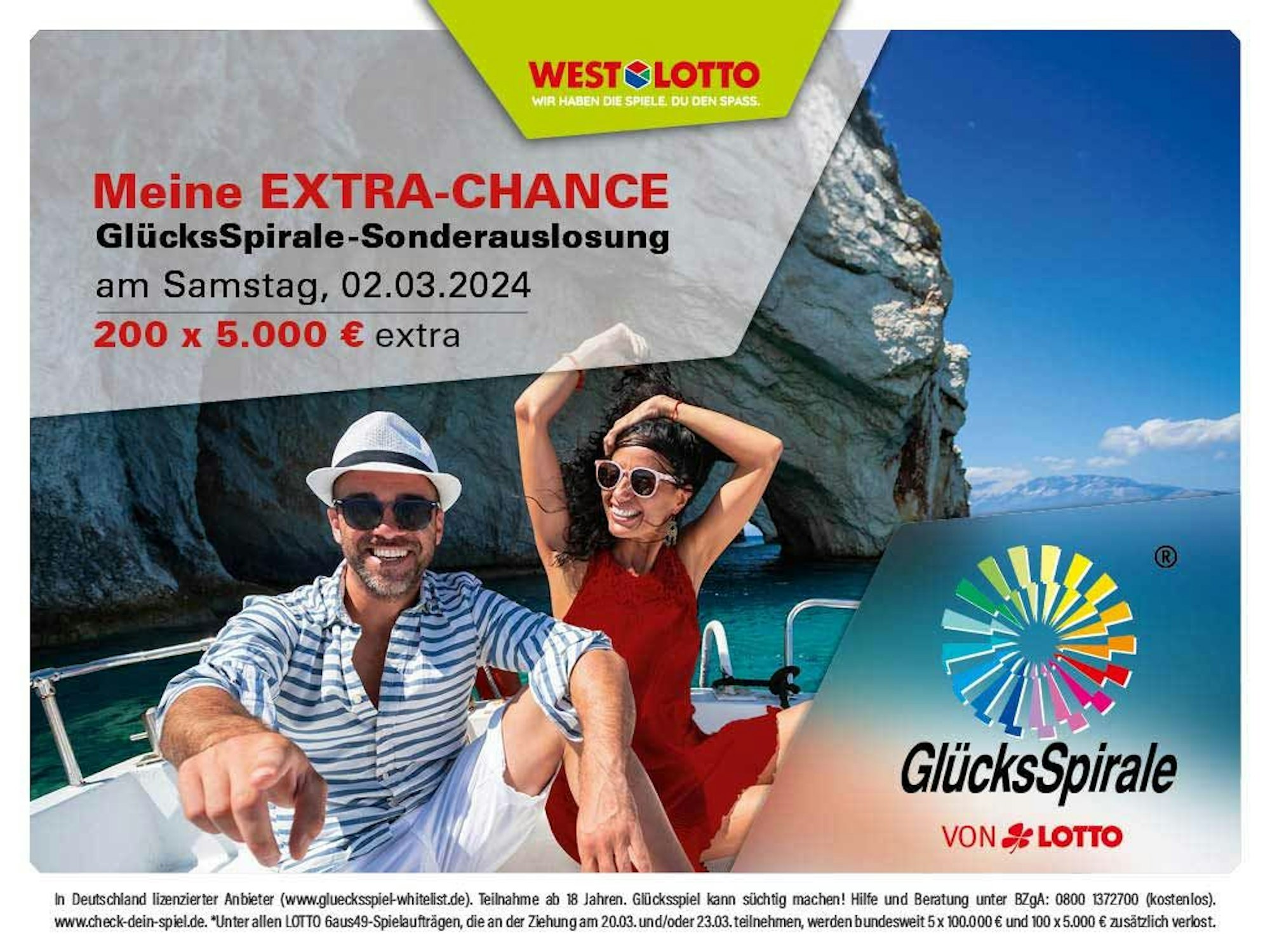 Extra-Chance bei der GlücksSpiraleZusätzlich 200 x 5.000 Euro am 2. März (Samstag)