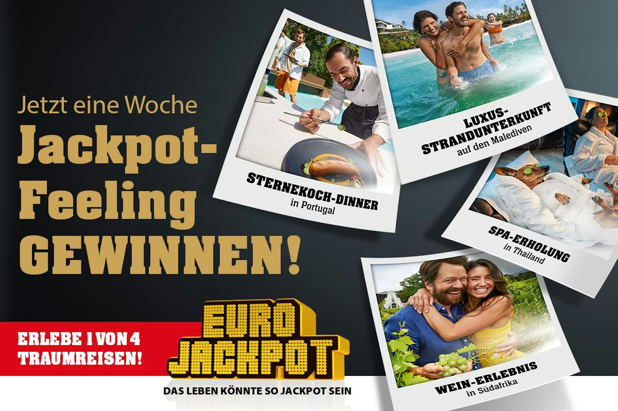 Das Eurojackpot-Gewinnspiel mit der Chance auf eine Woche Millionärs-Feeling wartet: Im Zeitraum 14. August bis 3. September einen oder mehrere Spielscheine für Eurojackpot abgeben und die Spielauftragsnummer, das gewünschte Reiseziel sowie die Kontaktdaten angeben.