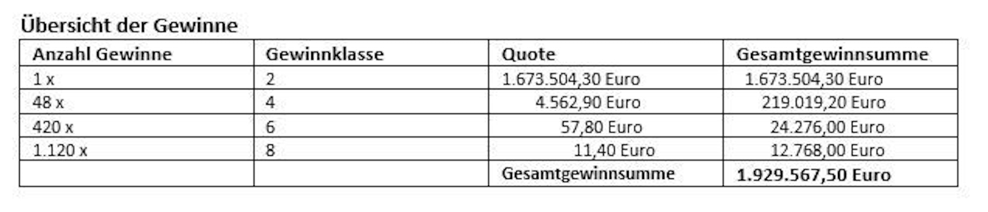 Durch das Systemspiel erzielte der Spielauftrag neben dem Treffer im zweiten Rang noch 48-mal Gewinnklasse 4 sowie 420-mal die Gewinnklasse 6. Hinzu kommen noch 1.120 Treffer im achten Gewinnrang, was in Summe einen zusätzlichen Gewinn von 256.063,20 Euro bedeutet, der ebenfalls auf die 75 Spielteilnehmer aufgeteilt wird. Für jeden der 91 Anteile ergibt sich somit eine Gewinnsumme von 21.204,01 Euro.