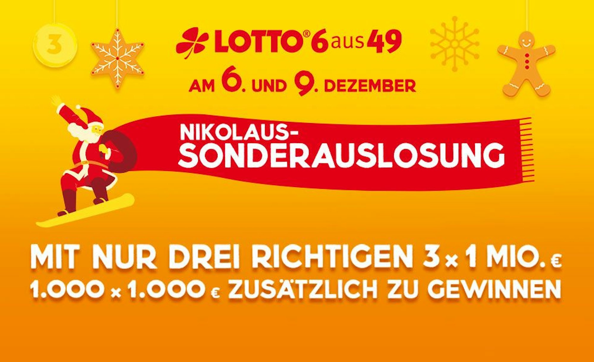 Das gibt es nur zu Nikolaus: Bei der bundesweiten Sonderauslosung von LOTTO 6aus49 am 6. Dezember (Mittwoch) und am 9. Dezember (Samstag) könnten drei Richtige eine Million Euro wert sein.