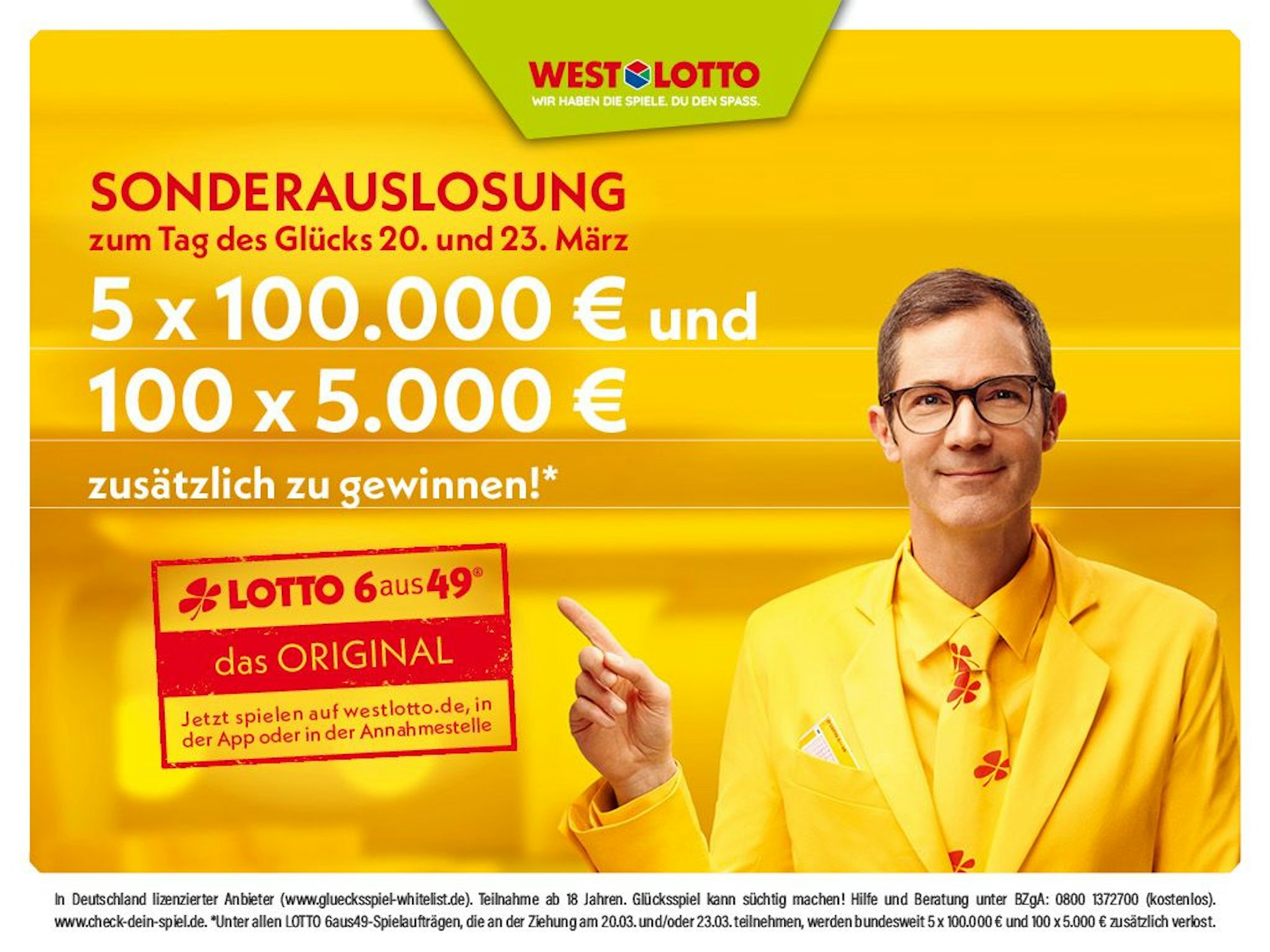 So darf es ebenfalls in diesem Jahr sein. Denn auch 2024 gibt es zum „Tag des Glücks“ bei LOTTO 6aus49 eine Sonderauslosung: am 20. März (Mittwoch) und 23. März (Samstag) werden bundesweit dieses Mal 5 x 100.000 Euro und 100 x 5.000 Euro zusätzlich ausgelost.