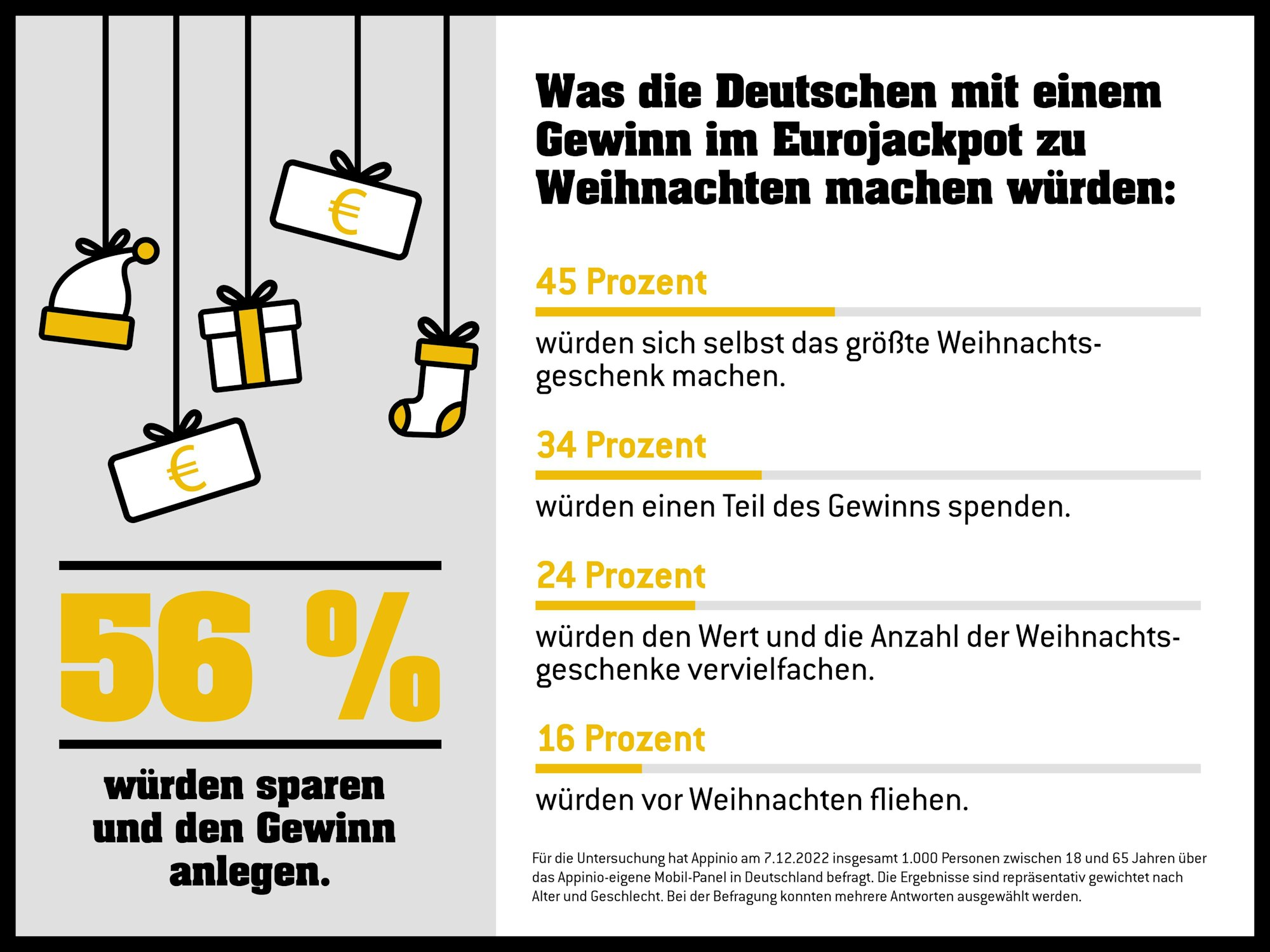 Zur 600. Ziehung der Lotterie Eurojackpot führte das Marktforschungsinstitut Appinio eine repräsentative Umfrage durch: Was würden die potenziellen Gewinner pünktlich zu Weihnachten mit einem Jackpotgewinn machen?