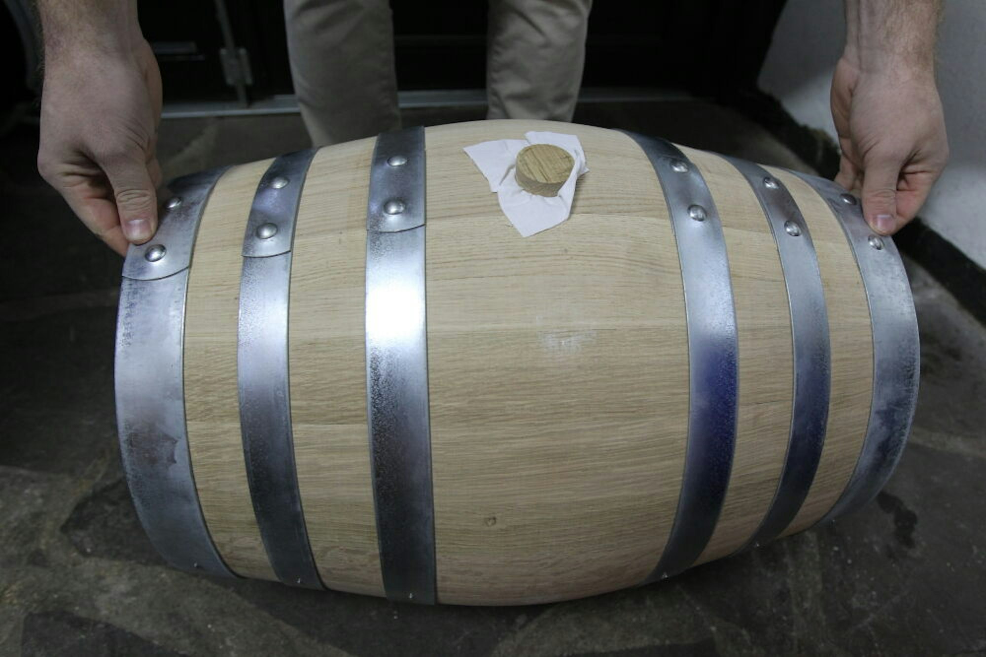 50 Liter passen in das Eichenfass, acht der nagelneuen Behälter werden mit dem gebrannten Korn gefüllt.
