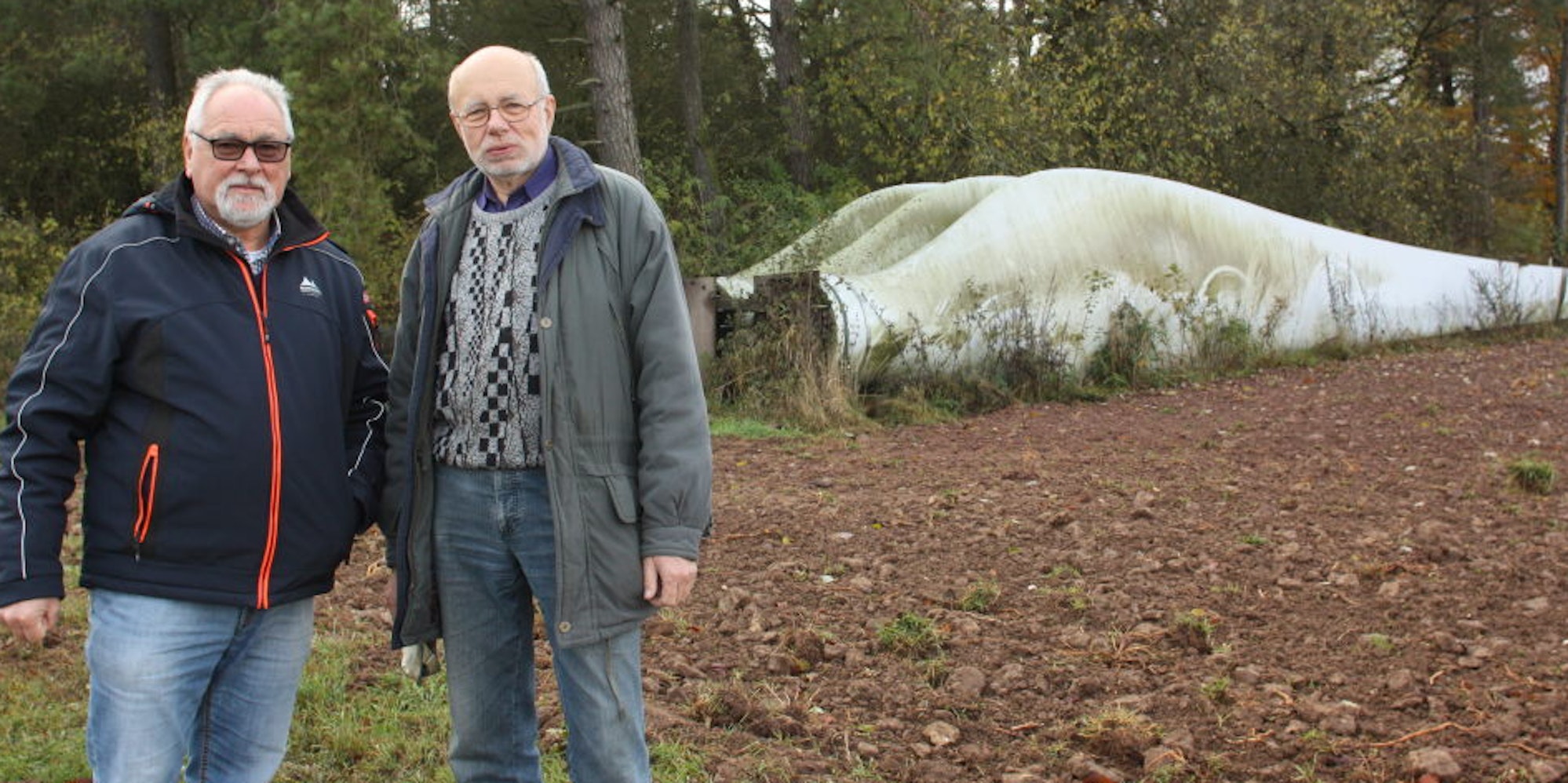 Die Ortsvorsteher Hans Reiff (rechts) und Robert Ohlerth sind mit dem Windpark Ravelsberg alles andere als glücklich. Drei alte Rotoren liegen noch ungenutzt in der Landschaft herum und ein drittes, großes Windrad soll demnächst aufgestellt werden.