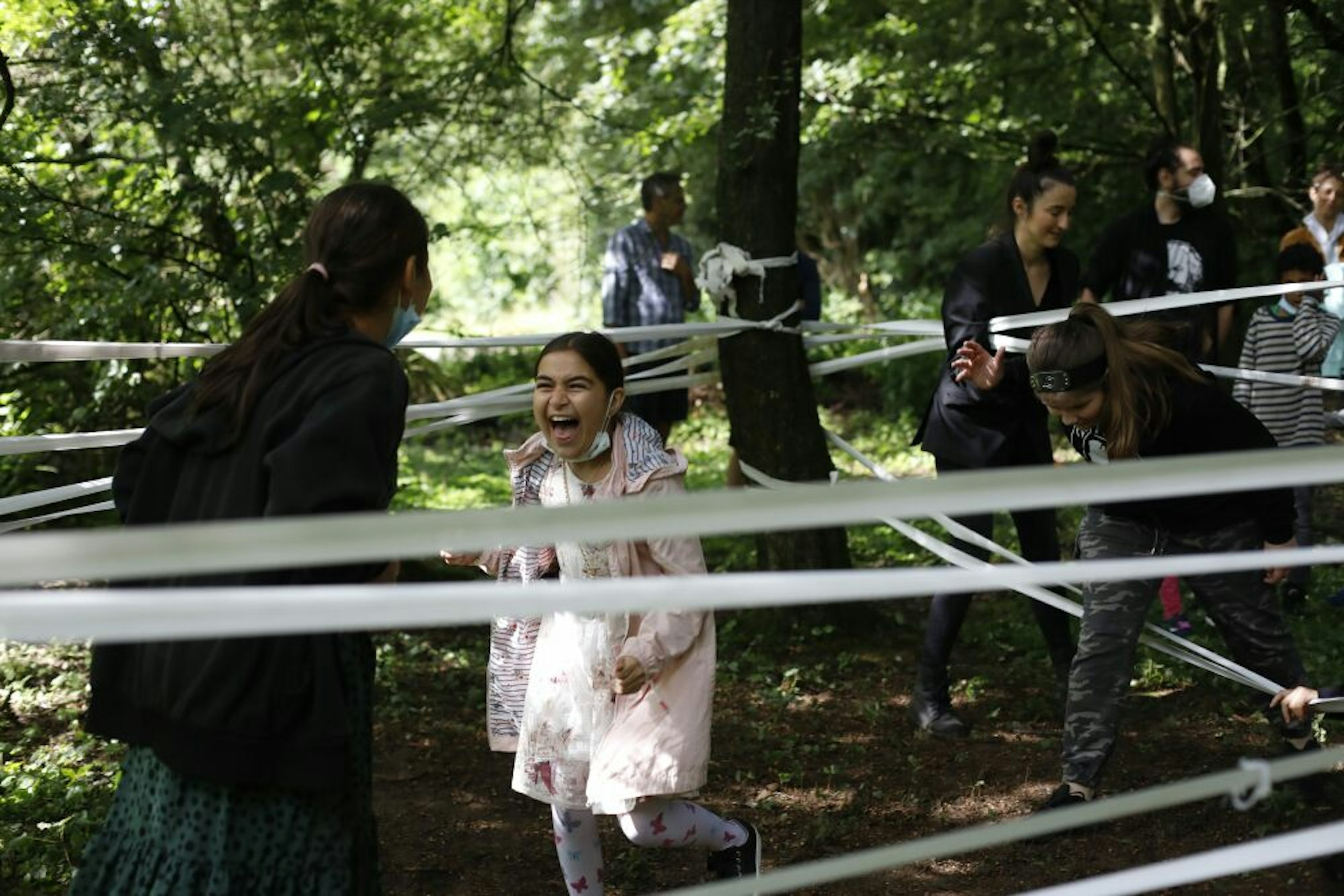 Auf der Lichtung bewegen sich die Schüler wie Spinnen über den Boden.