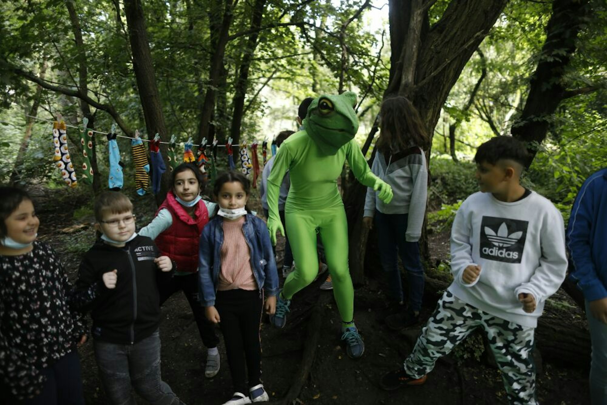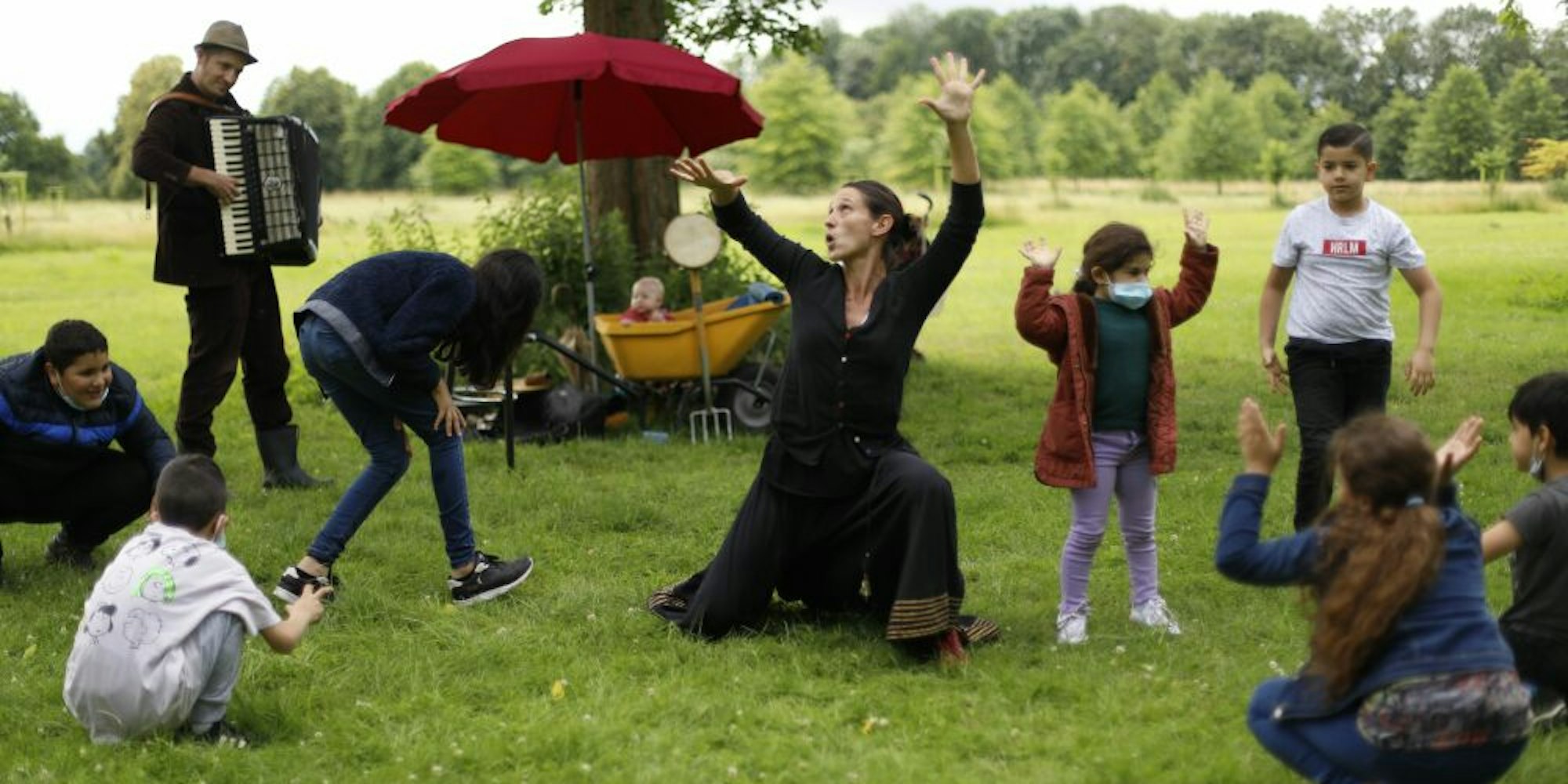Der „Klangkörper“-Aktionstag findet seit zehn Jahren einmal im Jahr an der Grundschule Kunterbunt statt. „Normalerweise wird das Schulhaus auf links gedreht“, sagt die Leiterin des Offenen Ganztags, Ute Ehresmann. Pandemiebedingt wurde die Präsentation aus Tanz und Musik in den nahen Sieben-Hügel-Park verlegt – auf Wiesen, unter Bäume oder auf kleine Lichtungen. Gegen die schlechte Wetterprognose habe man am Abend zuvor „getrommelt was das Zeug hielt“, sagte Thomas Gläßer, Leiter der Offenen Jazz Haus Schule, die den Aktionstag veranstaltet.