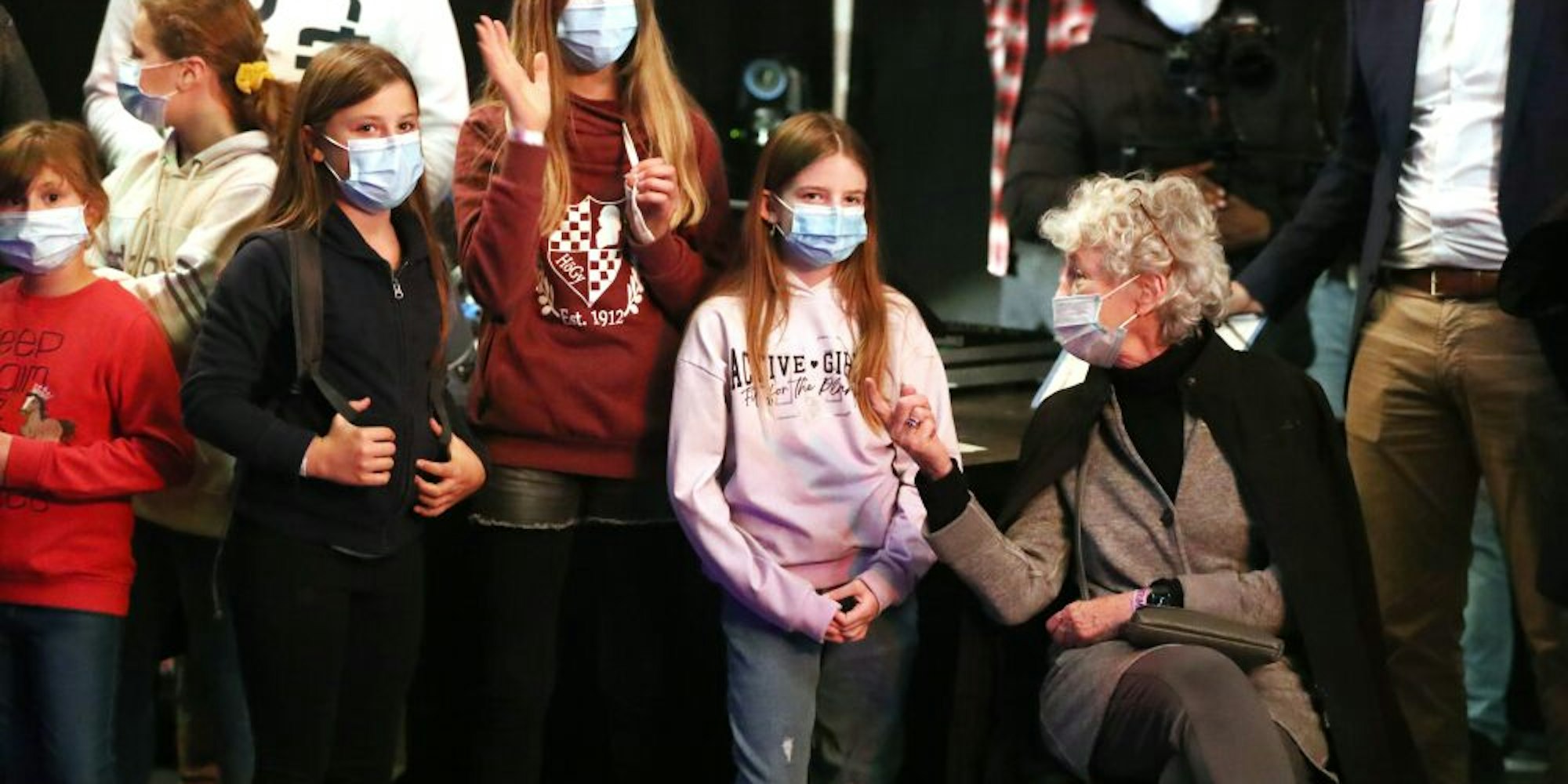 Hedwig Neven DuMont Im Gespräch mit Kindern im digitalen Jugendzentrum