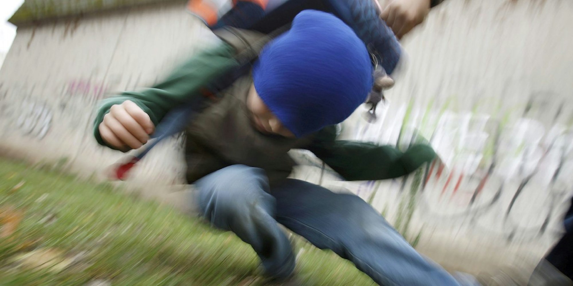Zwei Schüler prügeln sich am Rande eines Schulhofs.
