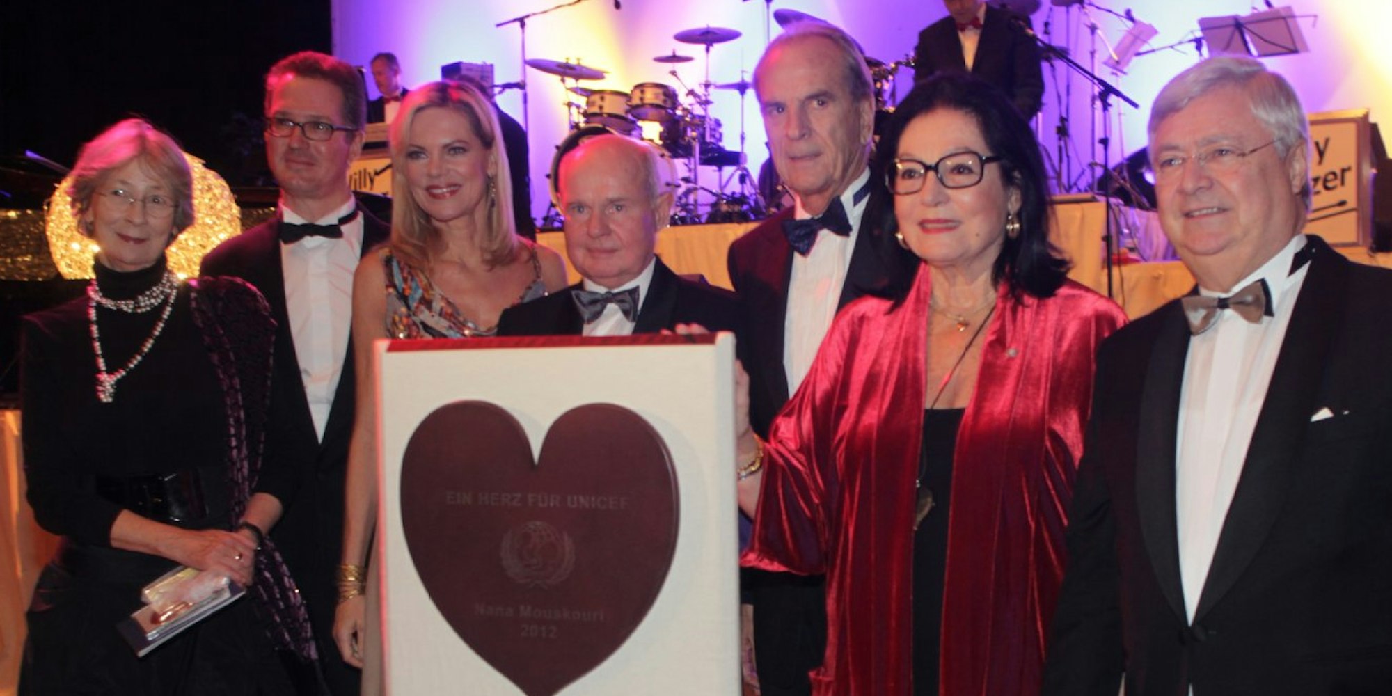 Hedwig Neven DuMont (von links), Martin Fischedick, Nina Ruge, Klaus-Peter Müller, Jürgen Heraeus, Nana Mouskouri und Heribert Klein, der Moderator der Unicef-Gala.